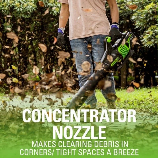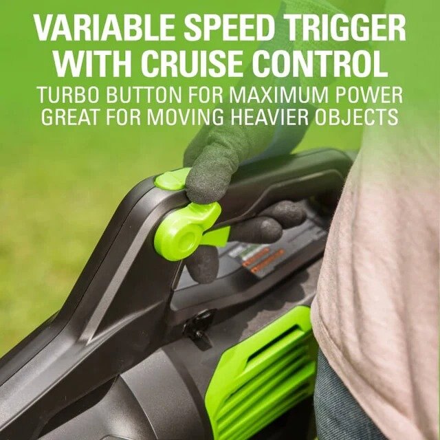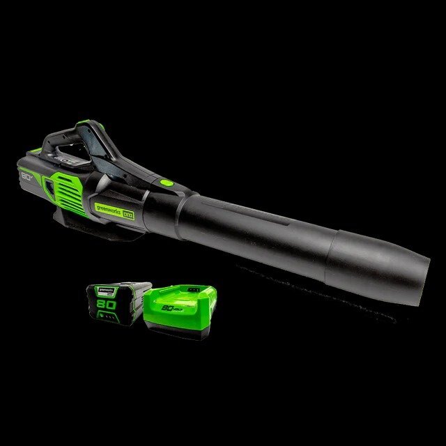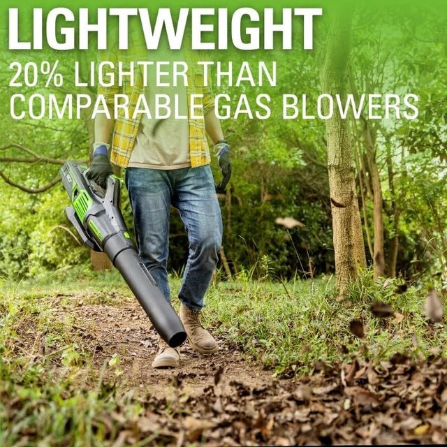 Powered by a pro-grade 80V lithium-ion battery, the new Greenworks battery-powered blower delivers power and performance typical of gas-powered blowers, without noise, fumes, or harmful emissions. With the incredible blowing force of 155 MPH max air speed and 650 CFM max air volume. It features our Jet Fan Technology and is equipped with a turbo button, trigger-activated variable speed control, and cruise control. This compact, lightweight blower starts with the squeeze of a trigger, with no aggravating pull cord. Plus, there’s no need to worry about spilling, mixing, or storing oil and fuel. |