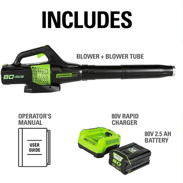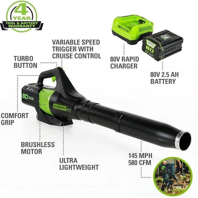 This handheld blower is capable of high-velocity air speeds up to 145 MPH and airflow up to 580 CFM to easily handle the toughest blowing tasks like clearing wet & heavy leaves, grass, and other stubborn debris. The Greenworks lineup features over 20 high-performance Pro 80V tools, allowing you to ditch your gas tools for an innovative, eco-friendly alternative.