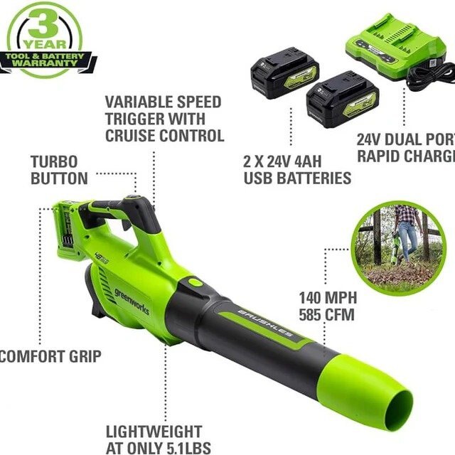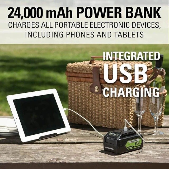The greenworks 24V lithium-ion platform powers over 125 indoor and outdoor products, including lawn mowers, blowers, string trimmers, chainsaws, power tools, and more! The 24V lithium-ion battery provides 20% more power and 35% more run-time, and delivers fade-free power with no memory loss after charging. The outdoor power equipment allows you to tackle up to 1/4 acre with the available 1.5Ah, 2Ah, 4Ah, and 5Ah batteries. USB ports are integrated into the BAG711, BAG708, BAG709, BAG710 batteries, making it a portable charger for phones, tablets, and other compatible electronic accessories. The greenworks 24V platform comes with a 3 year tool / battery warranty to protect your investment. |