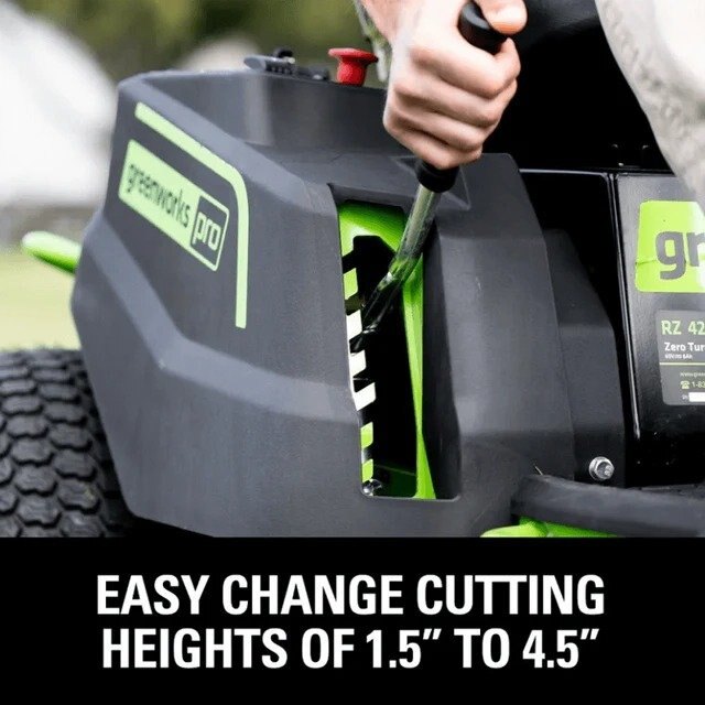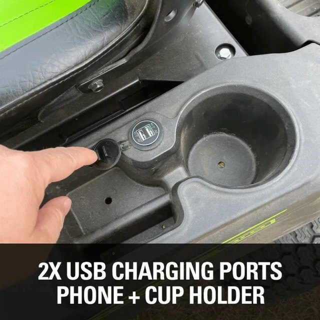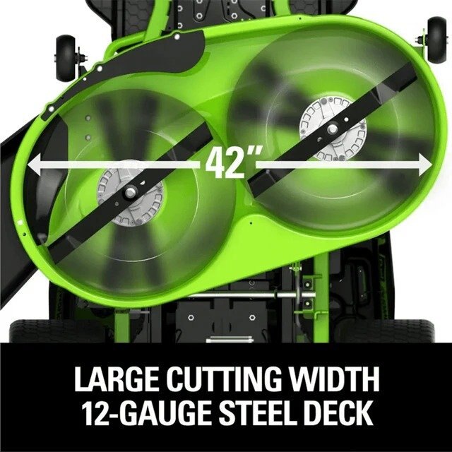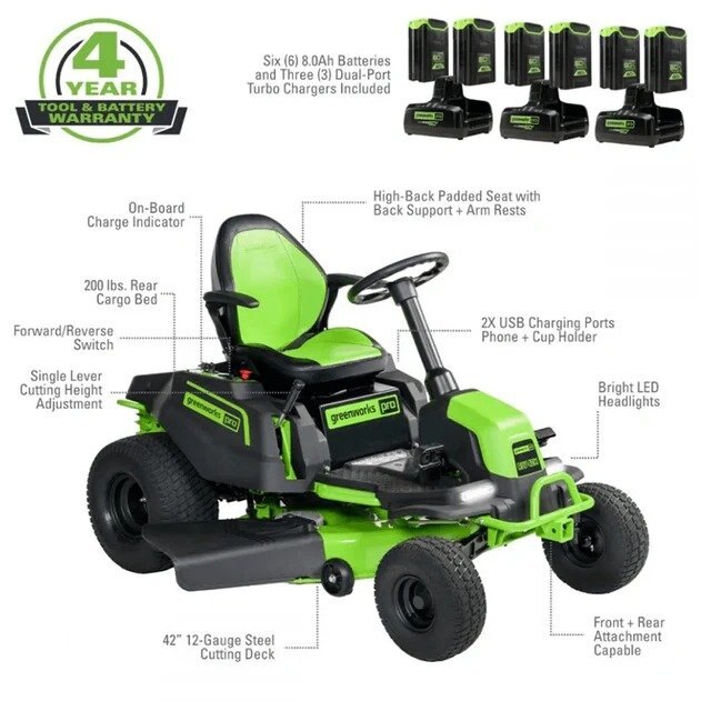 Greenworks electric riding mowers are here to level up your mow time. with 24hp equivalent TRUBRUSHLESS motor technology and with batteries that fully charge in just 90 minutes, there's no need to ever go back to the pump. While you sit comfortably in the high-back padded seat with back support and foldable armrests, our intelligent microchips constantly monitor grass conditions to provide the perfect amount of power output needed to get the job done. This means no wasted energy and no more bogging down even in the tallest, thickest, and wettest grass. Simply put, Greenworks electric riding mowers make light work of yard work. Additional features include high torque rear-wheel drive that can tackle hills up to a 15° incline, front and rear-mount attachment capability to maximize towing power and functionality, built-in Greenworks Greenshield theft protection, and more. The benefits of battery - now at the price of gas.