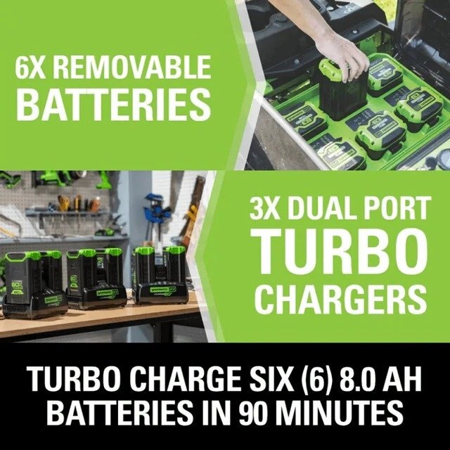 Includes: One (1) 60V 42" Crossover T Tractor Riding Lawn Mower, Six (6) 8.0Ah Batteries and Three (3) Dual Port Turbo Chargers |