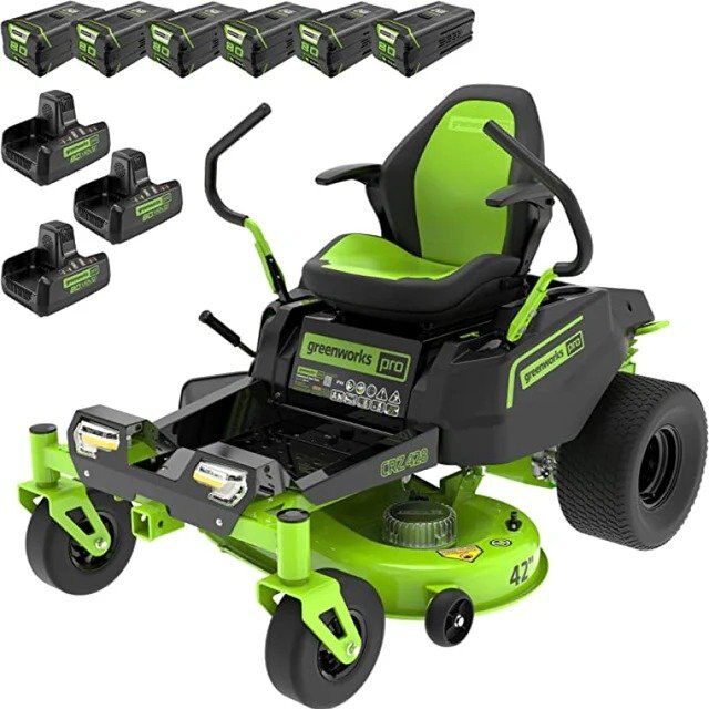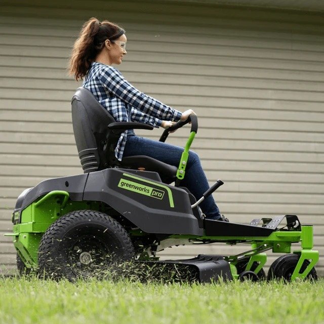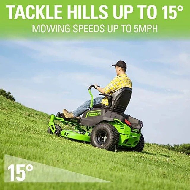 Greenworks electric riding mowers are here to level up your mow time with 24hp equivalent TRUBRUSHLESSTM motor technology. While you sit comfortably in the high-back padded seat ZTR with back-support and foldable arm rests, our intelligent microchips constantly monitor grass conditions to provide the perfect amount of power output needed to get the job done. This means no wasted energy and no more bogging down in even in the tallest, thickest, and wettest grass. Simply put, the Greenworks electric riding mowers make light work of yard work. Additional features include high torque rear-wheel drive that can tackle hills up to a 15° incline, front and rear-mount attachment capability to maximize towing power and functionality, built-in Greenworks Greenshield theft protection, and more. |
