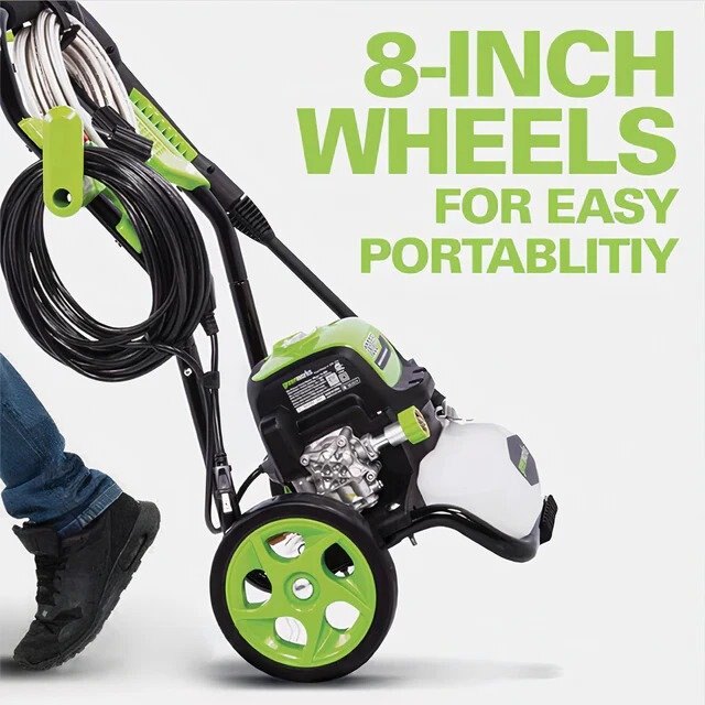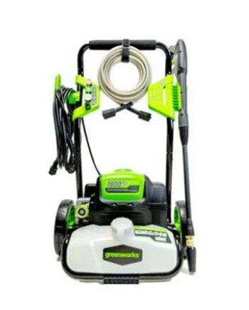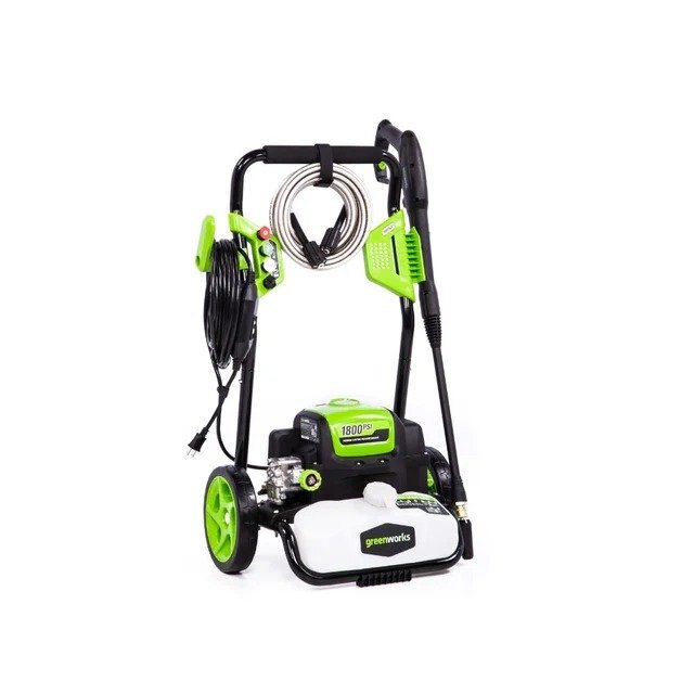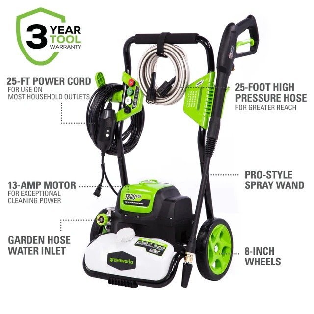 Welcome to a Life. Powered. by Greenworks. The world’s most powerful residential electric pressure washers! This electric power washer is ideal for everyday high-pressure cleaning jobs around the house. Whether it's the car, the house, the deck or the driveway, your stuff is sure to shine. The Greenworks 1800 PSI 13 Amp 1.1 GPM Electric Pressure Washer is sure to impress. Boasting up to 1.1 GPM of water flow, it's powerful, reliable and built for everyday cleaning. With a hassle-free push-button start, it powers up easily and gets to work fast. It's equipped with a 25-ft power cord with a water-resistant power plug, hassle-free kink-resistant hose that eliminates frustrating hose tangles, never-flat wheels for easy transportation, substantial 2-liter on-board soap tank, and on-board accessory storage. Backed by a 3-year tool warranty, it's built to last for years to come.