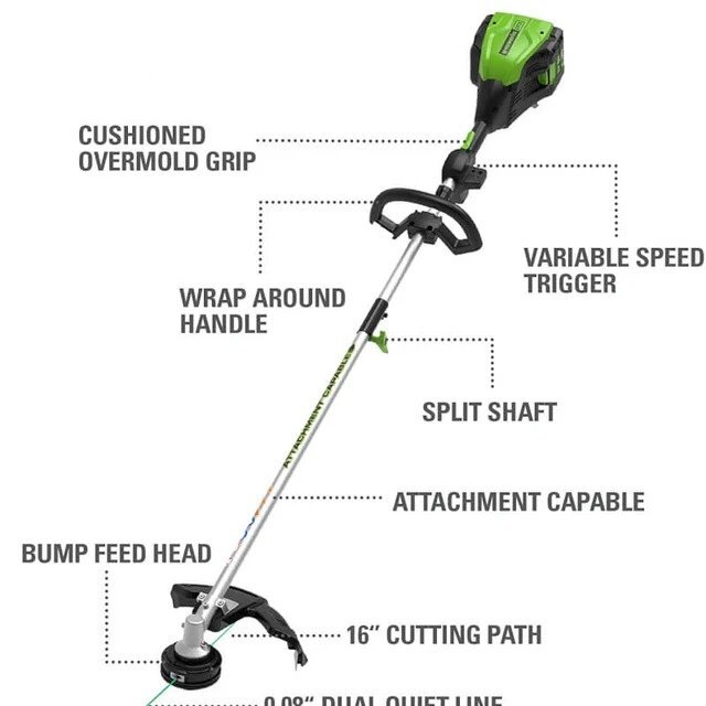Welcome to a Life. Powered. by Greenworks. Landscaping has never been easier with the Greenworks Pro 80V System; the most powerful cordless battery platform in outdoor power equipment. Start with a tool kit, then add tool only equipment. This weed trimmer can be used with all Greenworks 80V battery models! You can now breeze through your yard work with zero gas, zero emission and zero maintenance. Go from zero to power with a push of a button and get you through the task at hand with less vibration, less noise and less mess. Get all your trimming done in no time with the Greenworks 80V 16" attachment capable String Trimmer. This cordless grass trimmer features a 16-inch cutting path, brushless motor and can be used with most brands of attachments. Plus, all Greenworks Pro 80V tools include a 4 Year Limited Tool & Battery Warranty to ensure your investment is protected.
