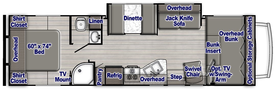 • LED HDTV 32” for Bedroom (N/A 6237, 6238, 6256) 40” for Front Bunk (for Kitchen in 6320) 24” for Bedroom in 6237, 6238