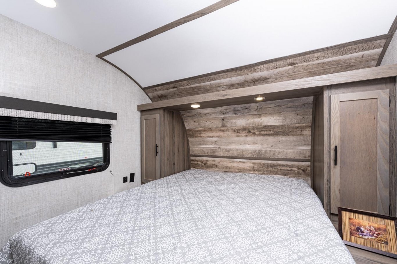 • Queen bed with innerspring mattress, under-bed storage