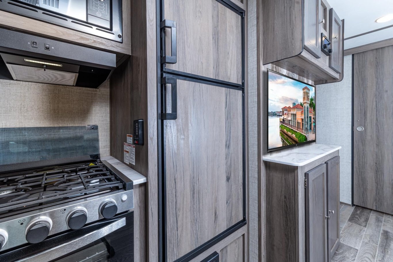 • Kitchen with 3-Burner Range, Vent Hood w/Light, 6.0 cu. ft. Double-Door Refrigerator
