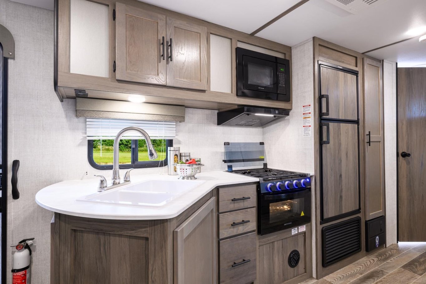 • Kitchen with 3-Burner Range, Vent Hood w/Light, 6.0 cu. ft. Double-Door Refrigerator