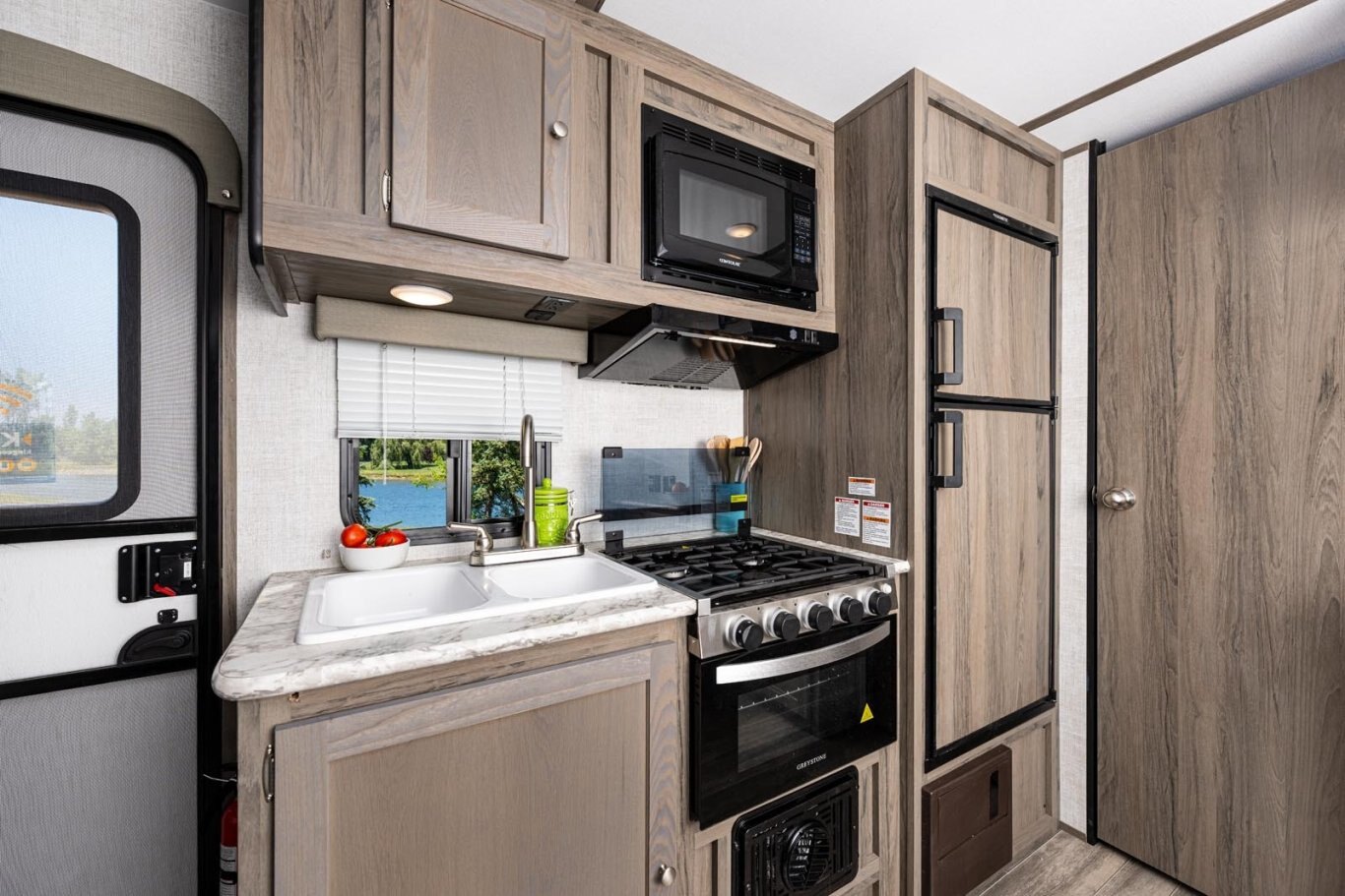 • Kitchen with 3-Burner Range, Vent Hood w/Light, 6.0 cu. ft. Double-Door Refrigerator