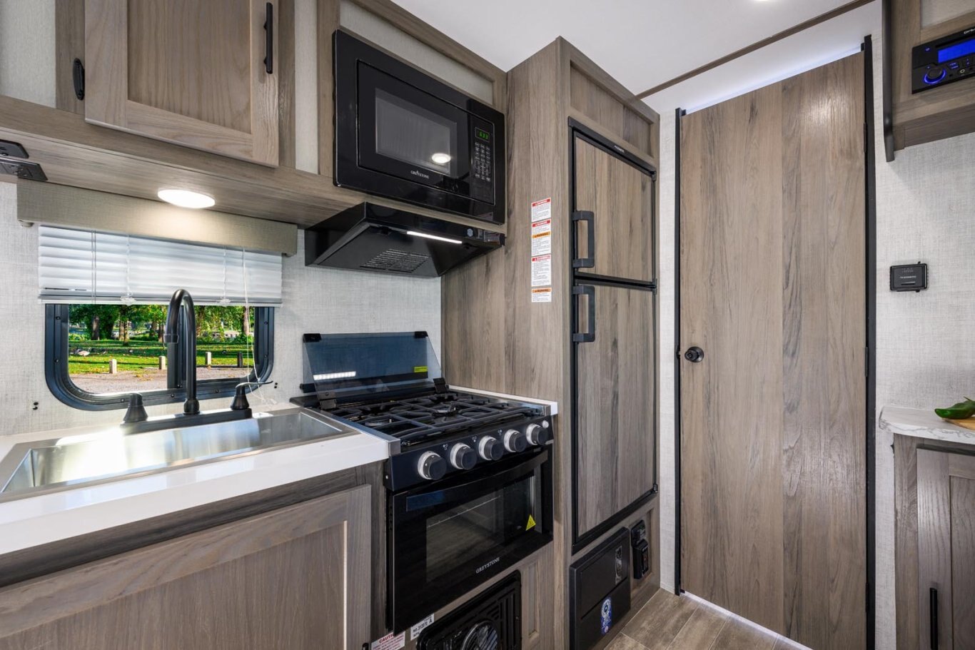 • Kitchen with 3-Burner Range, Vent Hood w/Light, 6.0 cu. ft. Double-Door Refrigerator