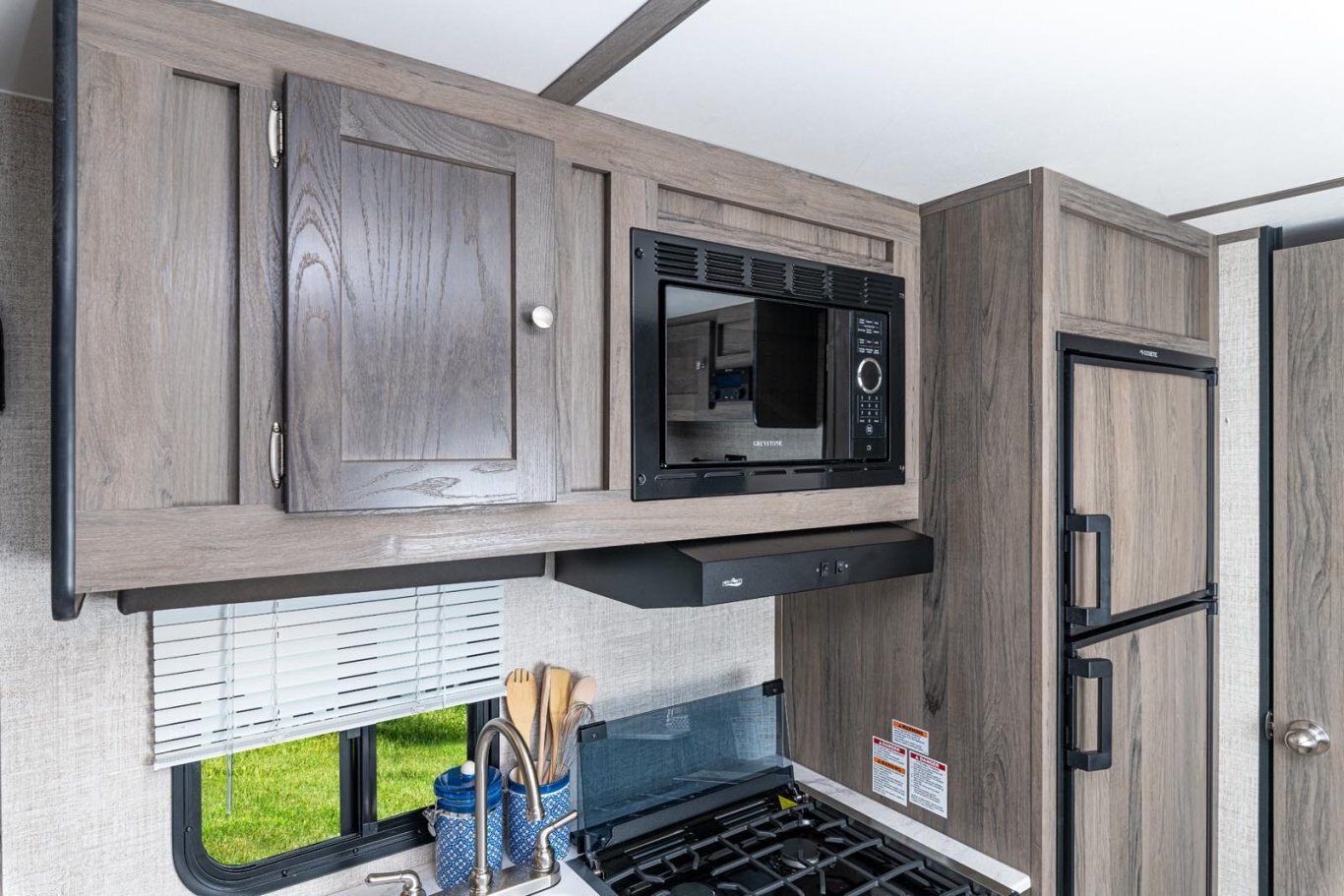 • Kitchen with 3-Burner Range, Vent Hood w/Light, 6.0 cu. ft. Double-Door Refrigerator