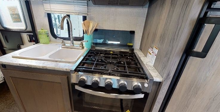 • Kitchen with 3-Burner Range, Vent Hood w/Light, 6.0 cu. ft. Double-Door Refrigerator