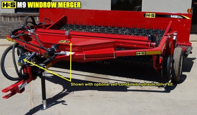 An optional self-contained hydraulic drive kit with PTO pump can be installed on the M9 Merger. This feature allows tractors with a minimum 5 g.p.m. hydraulic capacity and 1 remote to operate the merger.