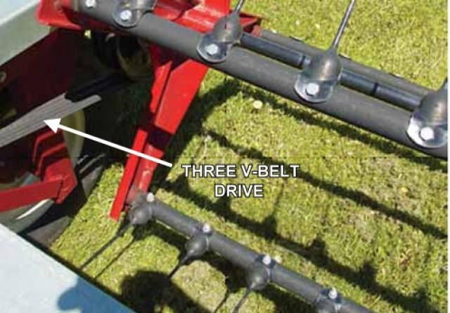 H&S Tedders use a three V-belt drive to the pick up reel (most other makes use only one V-belt). This V-belt drive absorbs shocks and prevents damage should tines strike an obstruction. The design and operation of the H&S Tedder has the advantage over the rotary style Tedder of not beating the leaves off alfalfa and clover.
