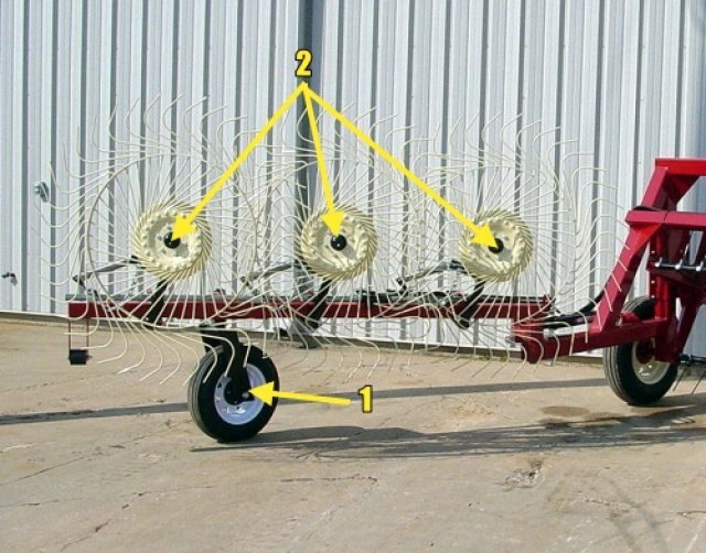 The hand crank (1) is for tedder reel height adjustment and the cam lever (2) is used to adjust the aggressiveness of the tedder teeth for a fluffier windrow.