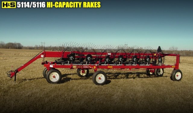 H&S 5114 & 5116 hi-capacity wheel rakes have the raking wheels positioned ahead of the rake arms, main frame beams and transport wheels. coupled with a high and wide end of frame, there are no hang-up points or restrictions when raking the heaviest of hay crops.
