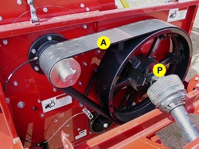 The PTO driven 21" grinder mill features an eight "A" section banded V-belt for a positive drive and a quick release pin (P) to disengage the mill.