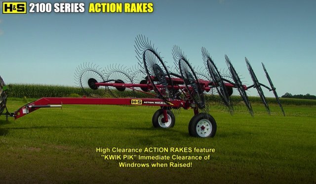 High Clearance Action Rakes features a "KWIK PIK" (patent pending) system for immediate clearance of windrows when raised, as well as greater clearance in the raking position and stability during transport.