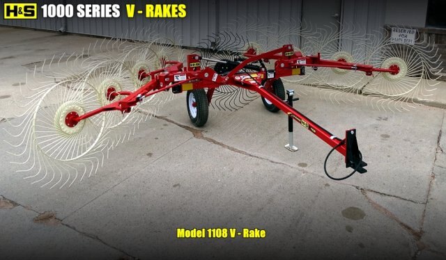 Raking width on the H&S CR rakes can be adjusted to 3 different positions with the pin and fine tuned by adjusting the turnbuckle screw. The hitch jack is used to adjust the windrow width as shown.