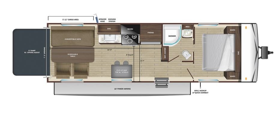 If you’re used to tent camping, take your camping to the next level with the Open Range Conventional Travel Trailer. Although it may seem tiny, the Open Range Conventional is mighty. It has a PVC roofing membrane with limited lifetime warranty, residential vinyl flooring throughout (including flush floor slideouts), main entry solid swing-down step, seamless pressed membrane countertops and the impressive Magnum™ Roof System.