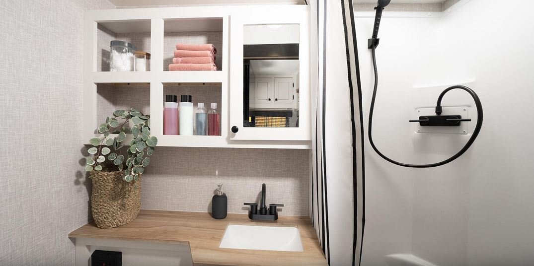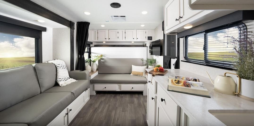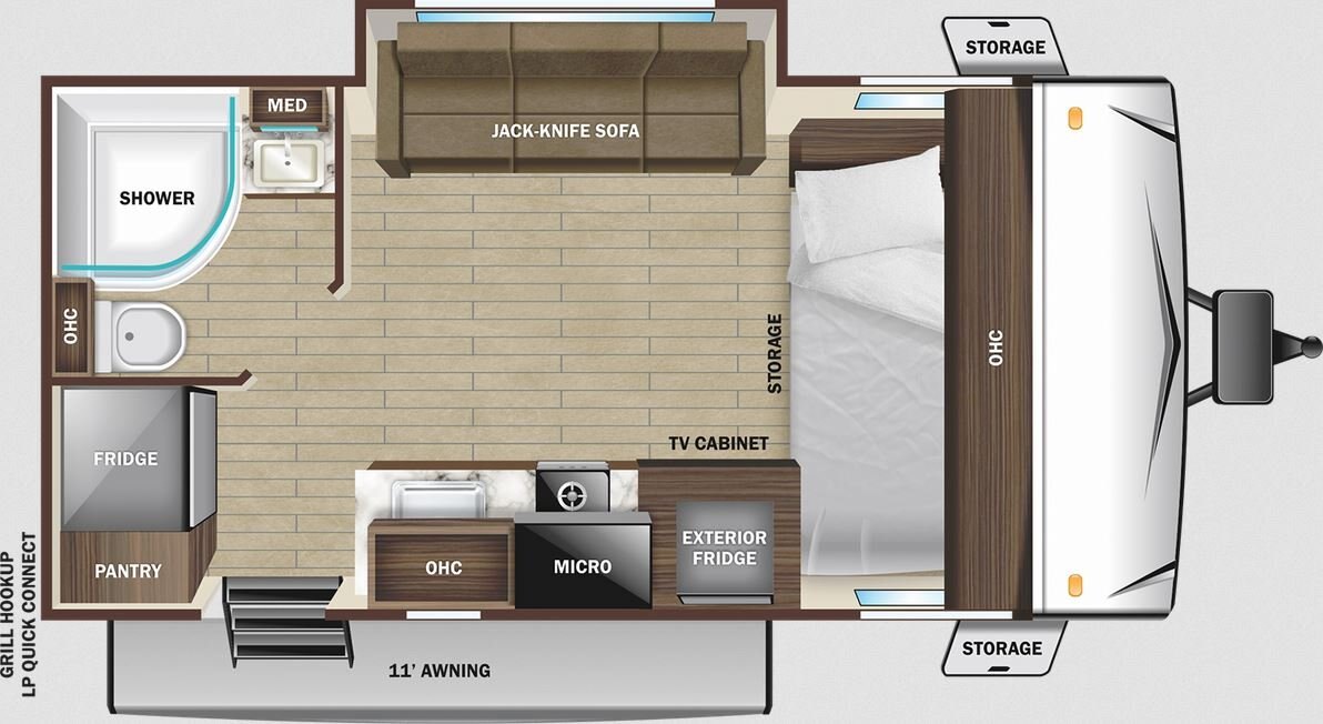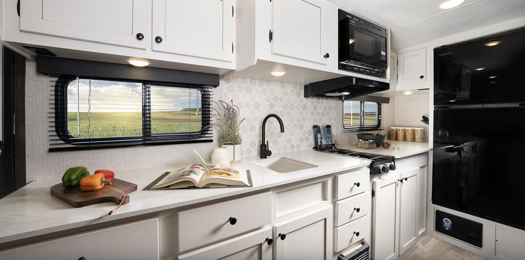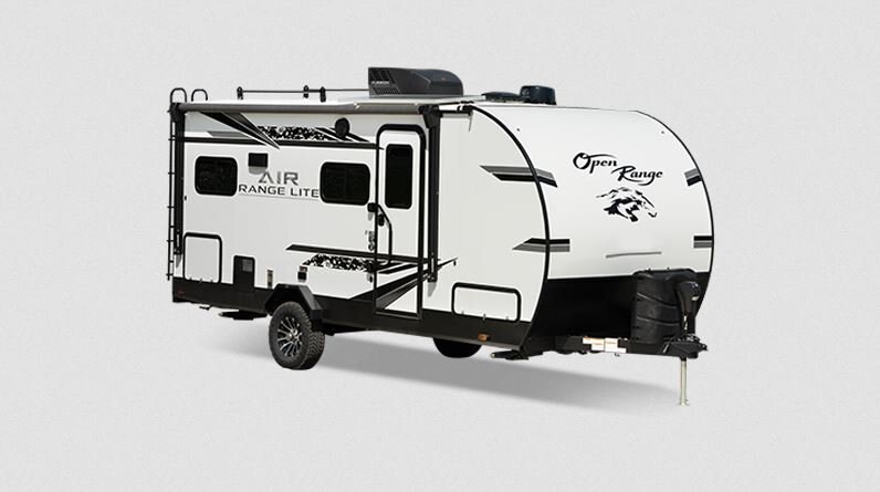 Get off the grid and into the wild with the Range Lite Air. Its Xtend Solar I Package has a 200 watt solar panel with 30 amp controller. The new friction hinge entrance door holds your RV’s entrance door in place and prevents it from swinging open or slamming shut. The Range Lite Air has a PVC roofing membrane with limited lifetime warranty, standard 12V refrigerator and a 5G antenna to stay connected when needed.