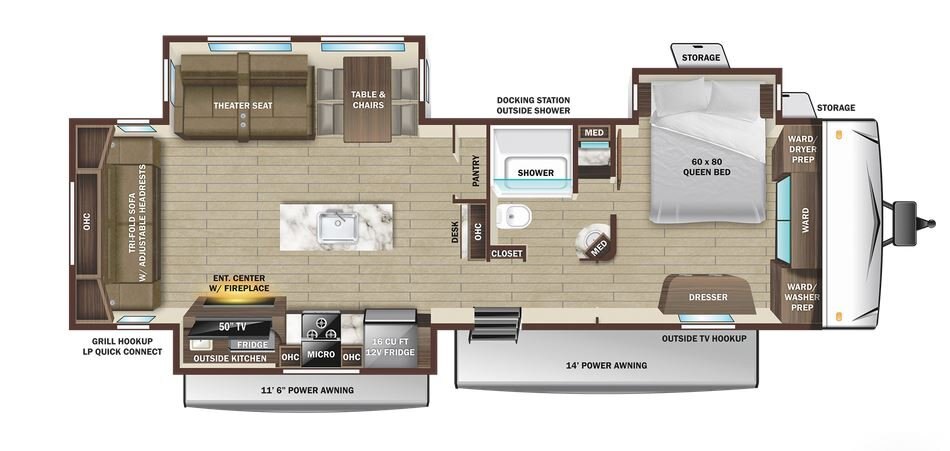 It’s the little things in the Open Range Travel Trailer that make all the difference. Like the glass shower door, residential microwave, roller blackout night shades, and even the built in cutting board and sink strainer. Of course it’s also the big things too, like the ACCU-SLIDE™ slide system, the PVC roofing membrane, the 100-inch wide body and the dome style digital TV antenna with Wi-Fi prep.