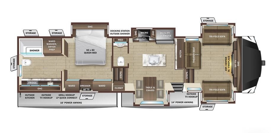 The Open Range Fifth Wheel beckons, with even more amenities and features than ever before. The 100-inch wide body unit with ACCU-SLIDE™ slide system and PVC roofing membrane doesn’t stop there. It offers a large residential stove with three-burner range and perhaps most impressive, VoiceLINK™. The VoiceLINK™ command system allows you to control lighting, cooling and heating, all with the sound of your voice.