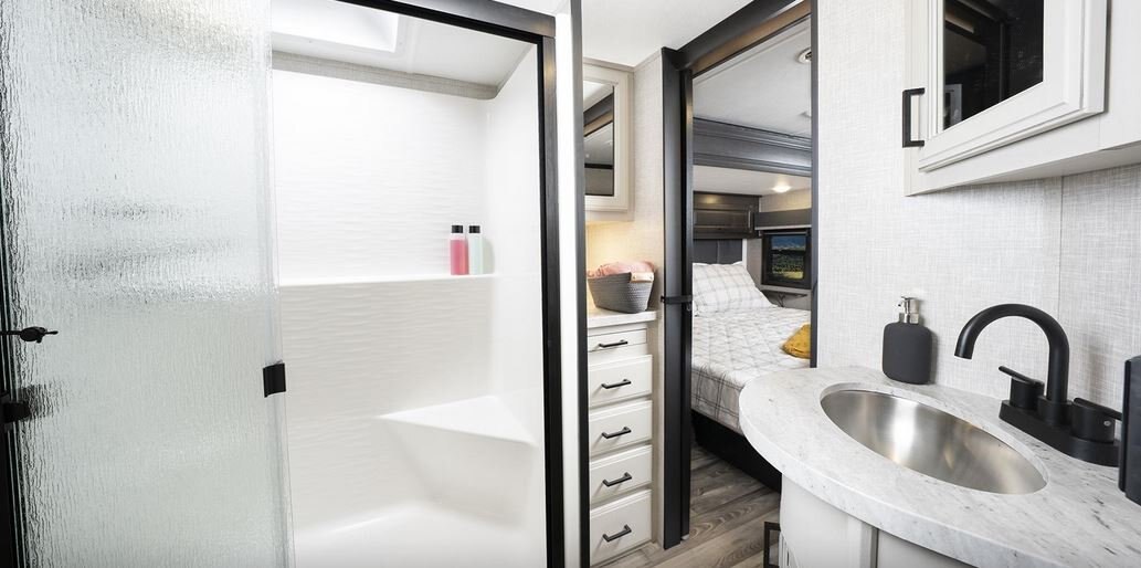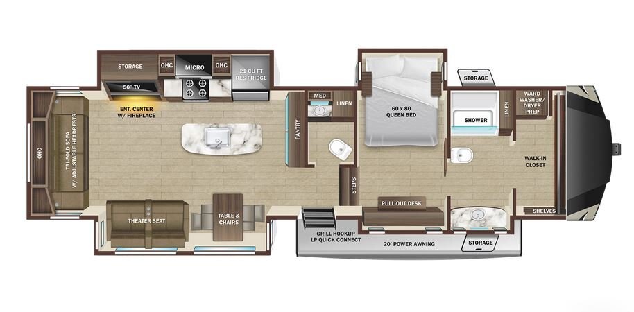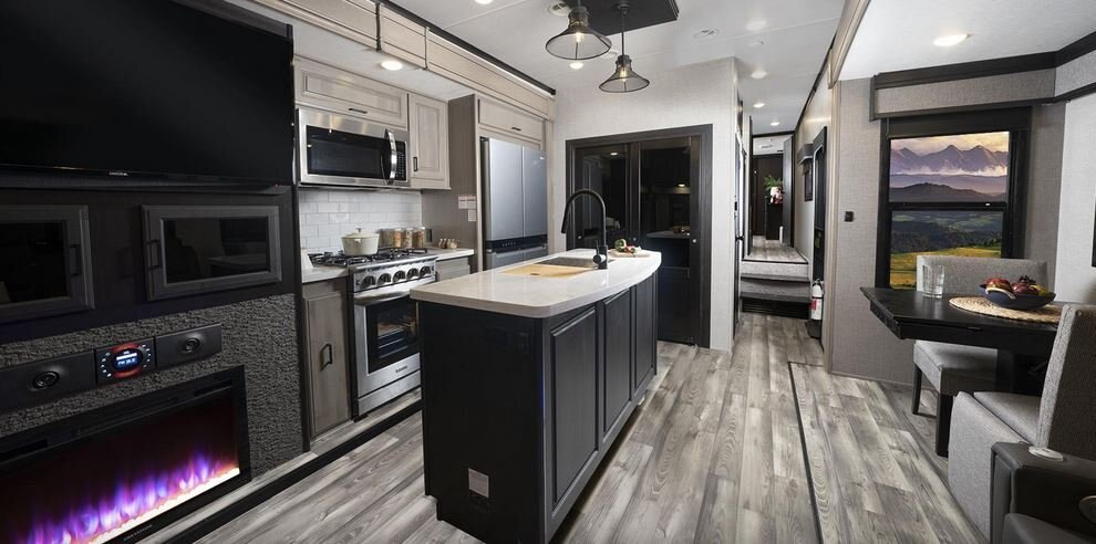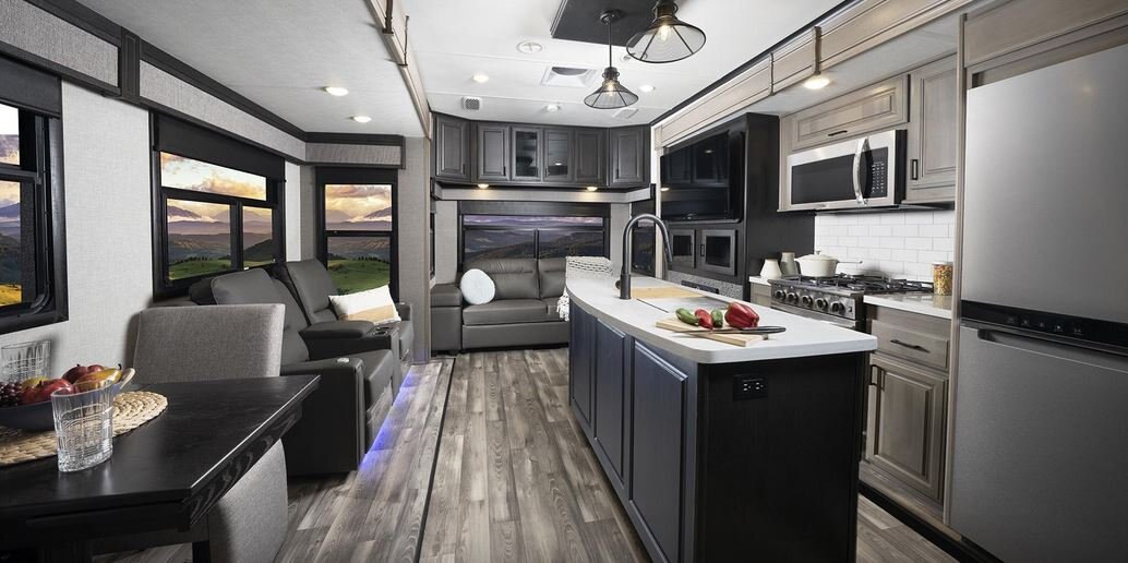 The big brother to the well-appointed Mesa Ridge XLT Fifth Wheel, you can only imagine the amenities in the Mesa Ridge. Let’s start with this full-profile fifth wheel’s LevelLOC™ system, the four or six point automatic leveling system with JT’s Strong Arms®, creating a reliable base to create your campsite on. Similar amenities to the ones found in Mesa Ridge XLT can be found here, but with upgrades like a 24-inch Insignia™ stove with four burner range and motion sensor lighting in the bedroom and hallway.