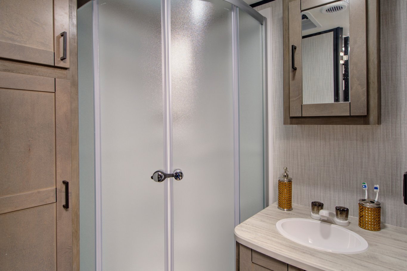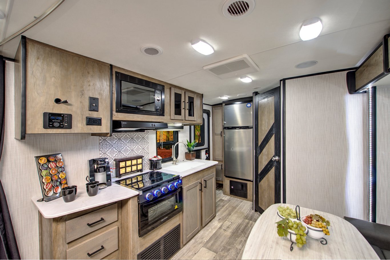 KITCHEN STANDARD FEATURES Steel ball-bearing, full extension drawer guides Stainless Steel Sink Infinity edge counter tops Hidden Hinges on Cabinetry High Rise Kitchen Faucet Conventional oven Three-burner range with glass top Premium flooring – tear, slip, mold, mildew and cold crack resistant Power range hood with light 10.7 cu. Ft. 12 Volt Refrigerator