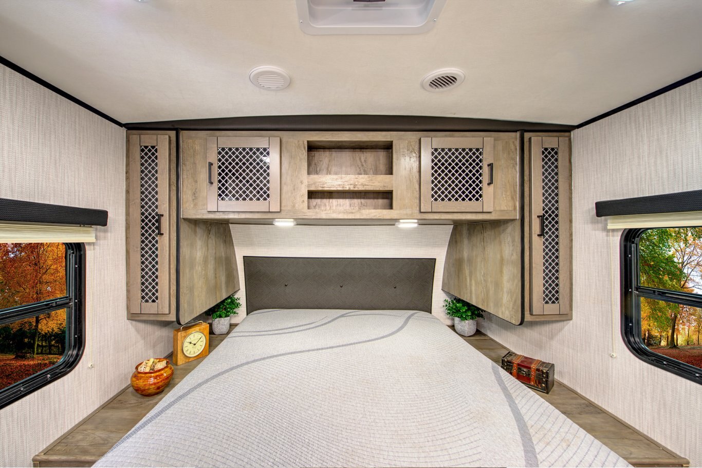 BEDROOM STANDARD FEATURES LED reading and ceiling lights 110 Volt outlets on both nightstands Quick Store underbed storage Residential headboard