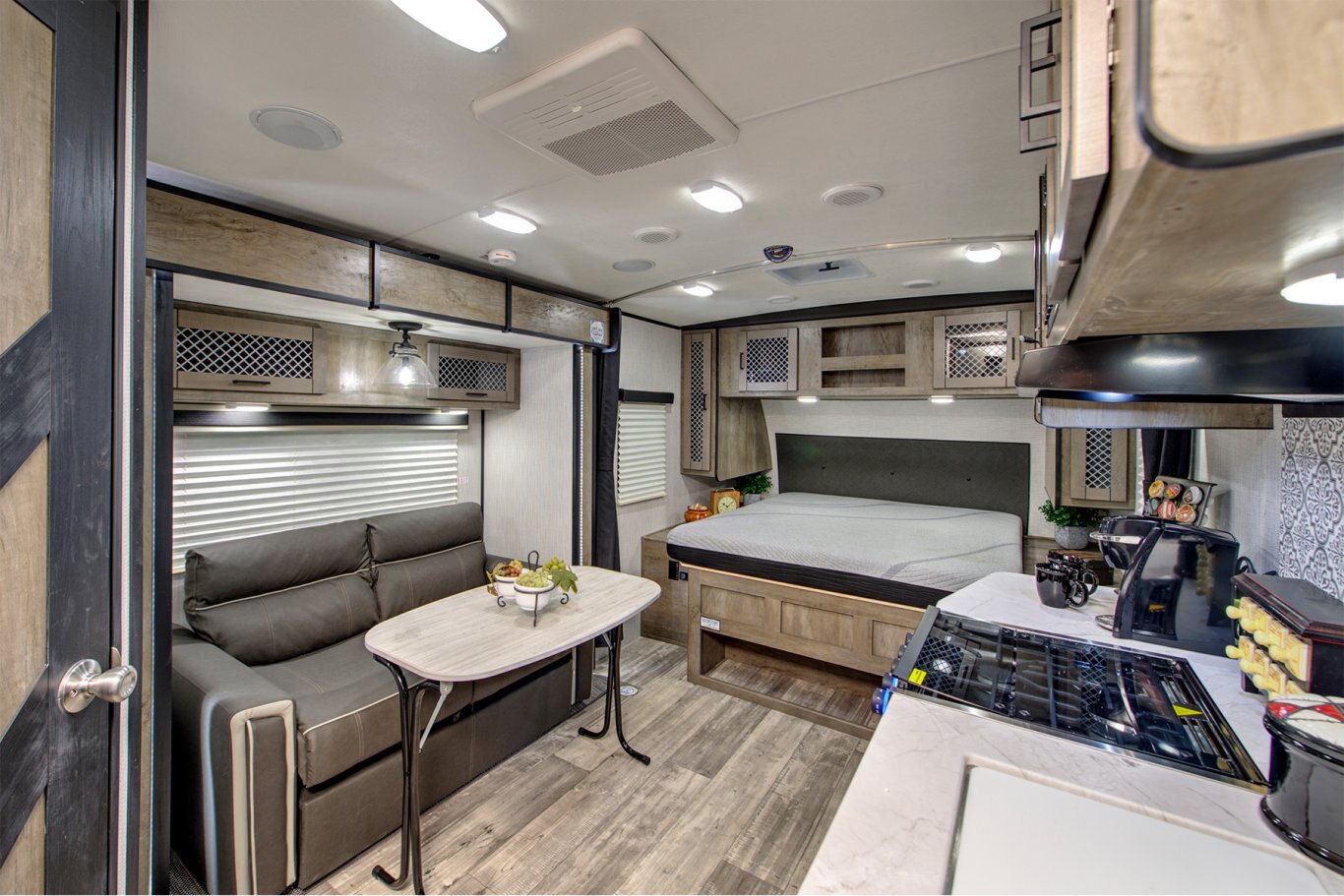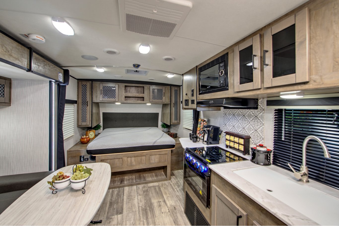 INTERIOR FEATURES Blackout roller shades in main slideout and bedroom (where applicable) Butcher block style kitchen countertops Stainless steel appliances Value hide – E – center with hidden valuable storage area (most models) Comfort select 72” x 80” gel infused residential king bed mattress Monitor panel in bathroom Dual ducted AC Gas/Electric DSI quick recovery water heater WiFi prep Upgraded & overstuffed residential furniture Cable TV prep Bluetooth Capable FM Radio with HDMI pass through TV antenna with booster Designer accent walls LED lights Residential interior doors *Some models produced in our Idaho facility may vary from specs identified