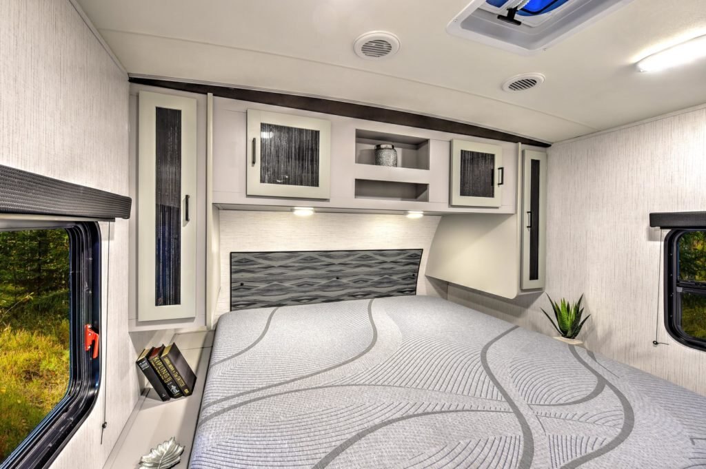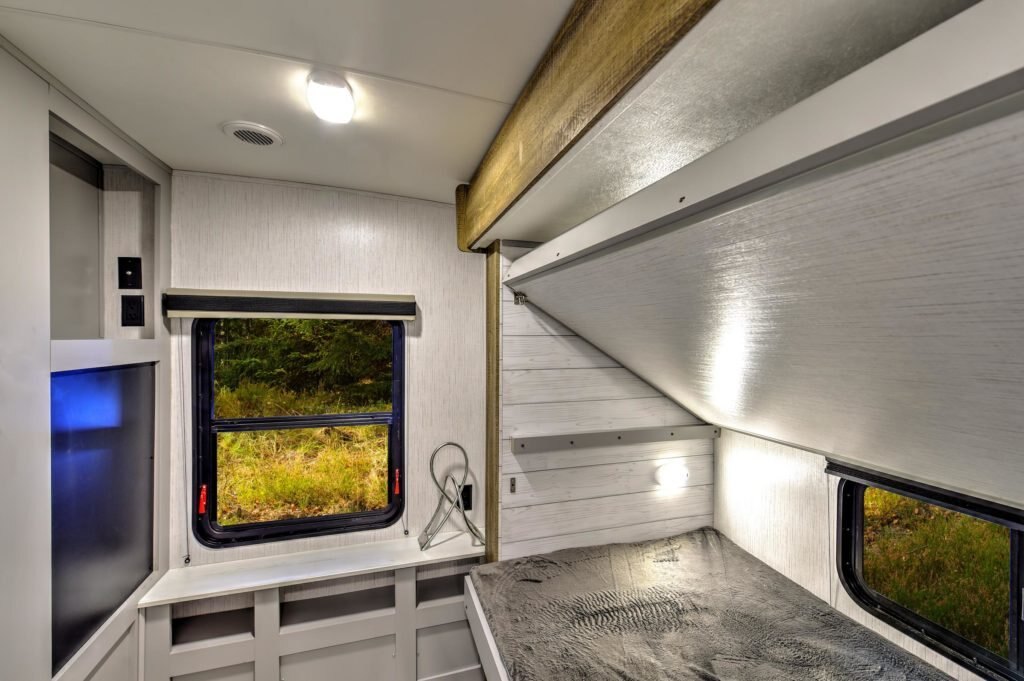CONSTRUCTION STANDARD FEATURES 2” thick Azdel laminated sidewalls with lightweight non wood substrate and sound barrier. Heated and enclosed underbelly 8 ft. wide design Power Tongue and Stabilizer Jacks Fully walkable roof Diamond plate front rock guard Rock block galvanized wheel wells 8” wide durable tongue and groove plywood floors Tinted safety glass windows Finished and insulated super king kong sized pass through storage (67.5 CU ft of storage)