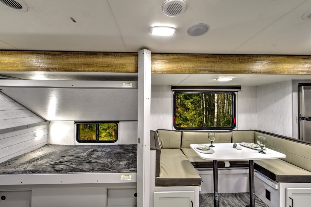 LIGHTWEIGHT STRENGTH PACKAGE OPTIONAL FEATURES* Laminated crowned roof system (N/A on West Coast models) Block foam brick insulation Aluminum construction Enclosed and heated underbelly Tinted safety glass windows 2″ thick sidewall construction with Azdel Four stabilizer jacks WIDE-TRAXX axle placement HD leaf spring suspension Dual 20 lb. LP tanks Weather Guard thermal protection *package is forced on all models