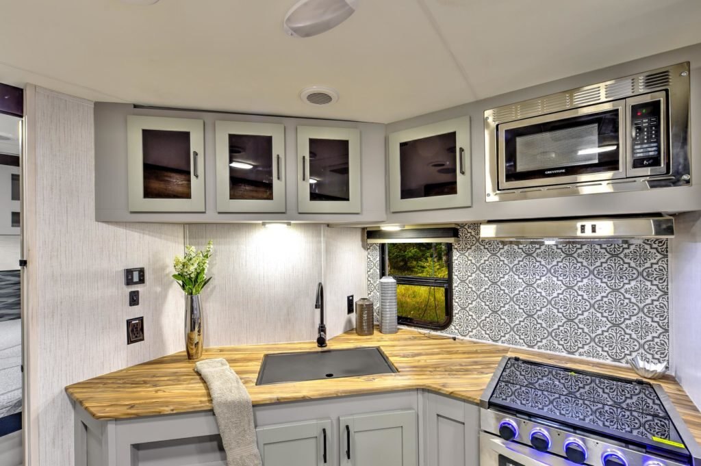 KITCHEN STANDARD FEATURES Steel ball-bearing, full extension drawer guides Stainless Steel Sink Infinity edge counter tops Hidden Hinges on Cabinetry High Rise Kitchen Faucet Conventional oven Three-burner range with glass top Premium flooring – tear, slip, mold, mildew and cold crack resistant Power range hood with light 10.7 cu. Ft. 12 Volt Refrigerator
