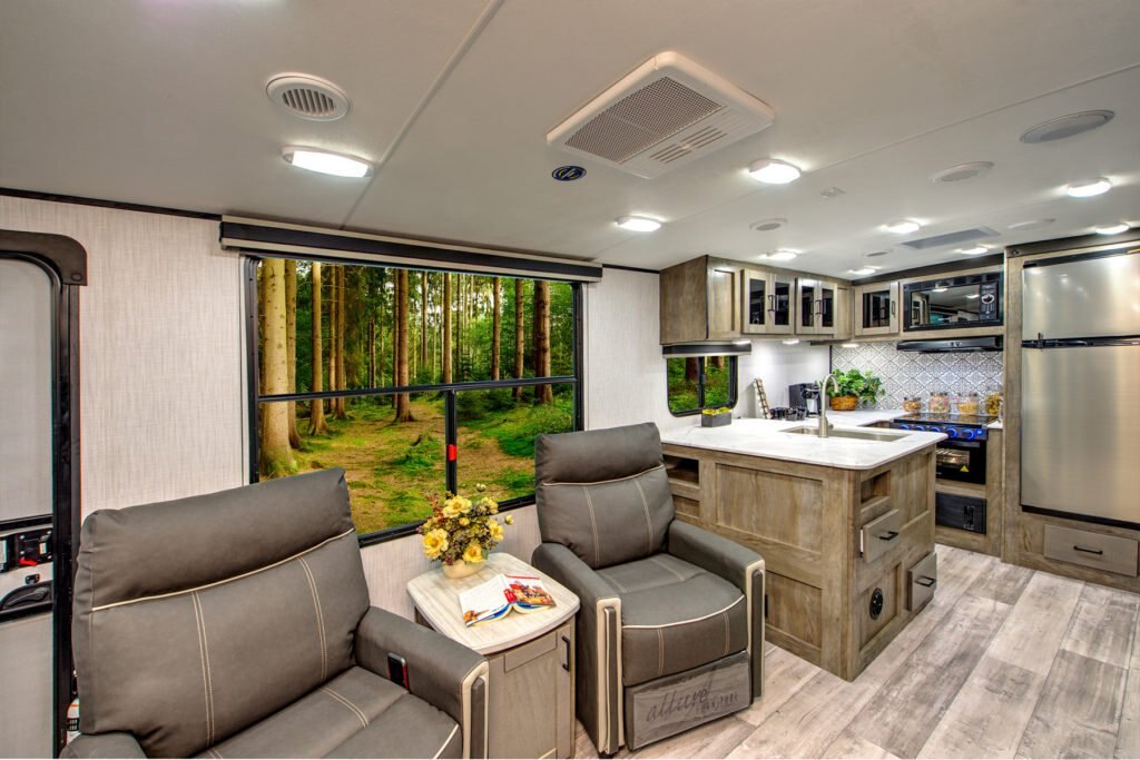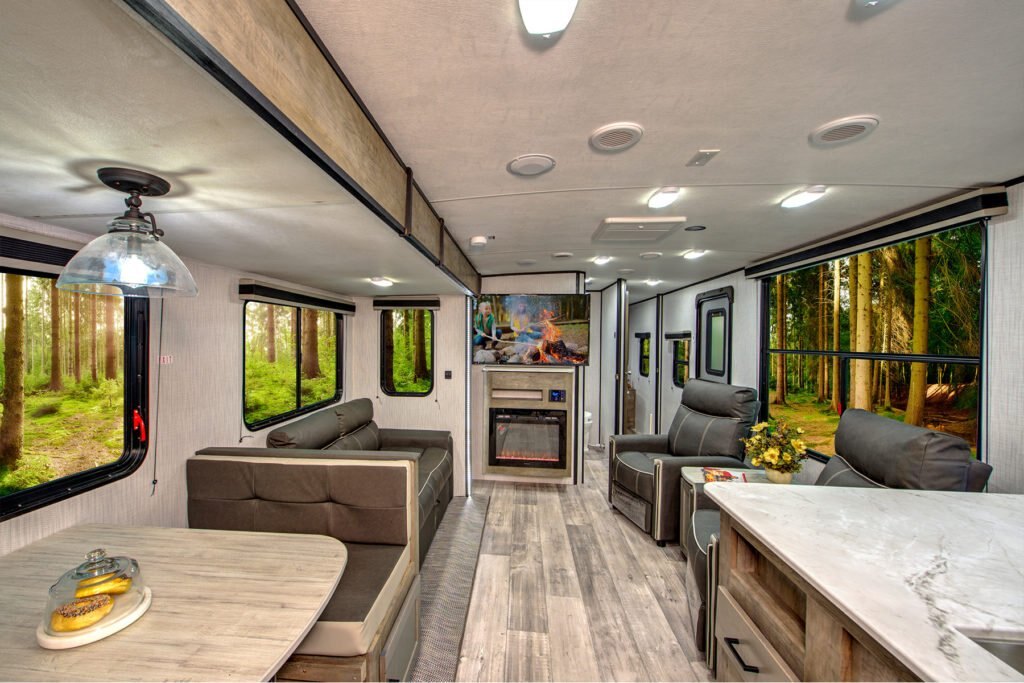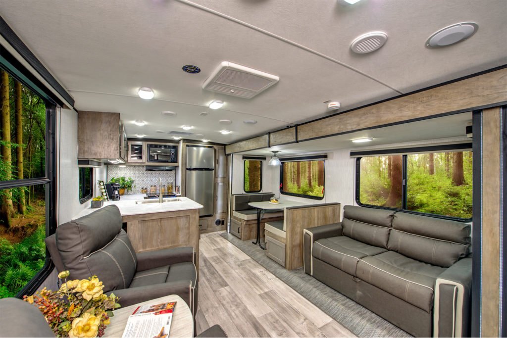 No matter which direction you’re headed, this spacious, innovative travel trailer gets you there with ease. With an open concept and oversize windows, there’s room enough for the whole family. The EZ Sweep carpet free slide room makes cleaning a snap. And the all new Super King Kong sized storage space holds everything an active family needs.