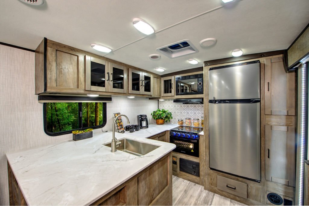 KITCHEN STANDARD FEATURES Steel ball-bearing, full extension drawer guides Stainless Steel Sink Infinity edge counter tops Hidden Hinges on Cabinetry High Rise Kitchen Faucet Conventional oven Three-burner range with glass top Premium flooring – tear, slip, mold, mildew and cold crack resistant Power range hood with light 10.7 cu. Ft. 12 Volt Refrigerator