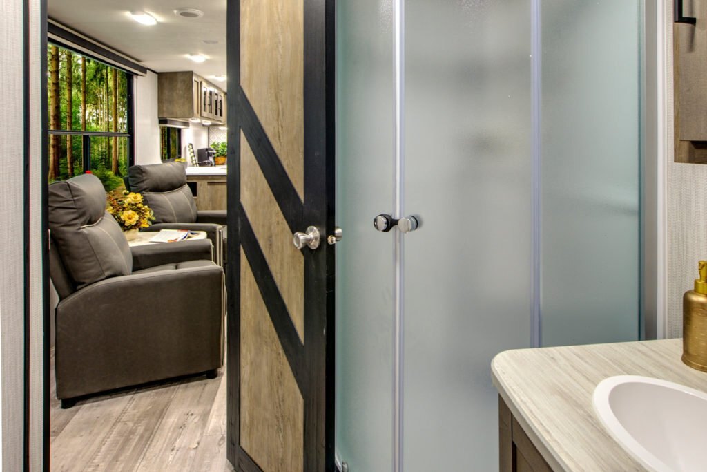 INTERIOR FEATURES Blackout roller shades in main slideout and bedroom (where applicable) Butcher block style kitchen countertops Stainless steel appliances Value hide – E – center with hidden valuable storage area (most models) Comfort select 72” x 80” gel infused residential king bed mattress Monitor panel in bathroom Dual ducted AC Gas/Electric DSI quick recovery water heater WiFi prep Upgraded & overstuffed residential furniture Cable TV prep Bluetooth Capable FM Radio with HDMI pass through TV antenna with booster Designer accent walls LED lights Residential interior doors *Some models produced in our Idaho facility may vary from specs identified