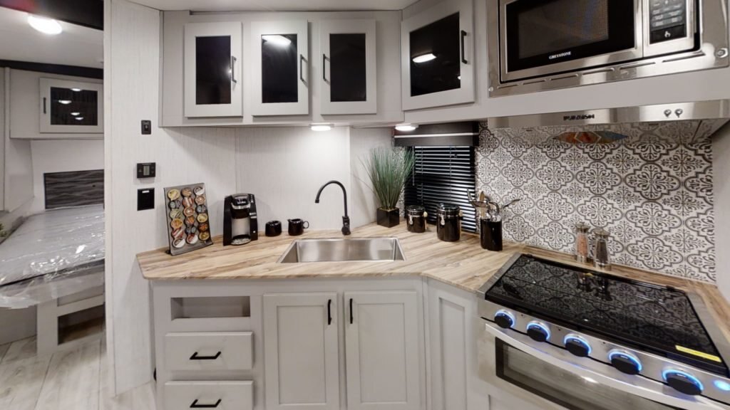 KITCHEN STANDARD FEATURES Steel ball-bearing, full extension drawer guides Stainless Steel Sink Infinity edge counter tops Hidden Hinges on Cabinetry High Rise Kitchen Faucet Conventional oven Three-burner range with glass top Premium flooring – tear, slip, mold, mildew and cold crack resistant Power range hood with light 10.7 cu. Ft. 12 Volt Refrigerator