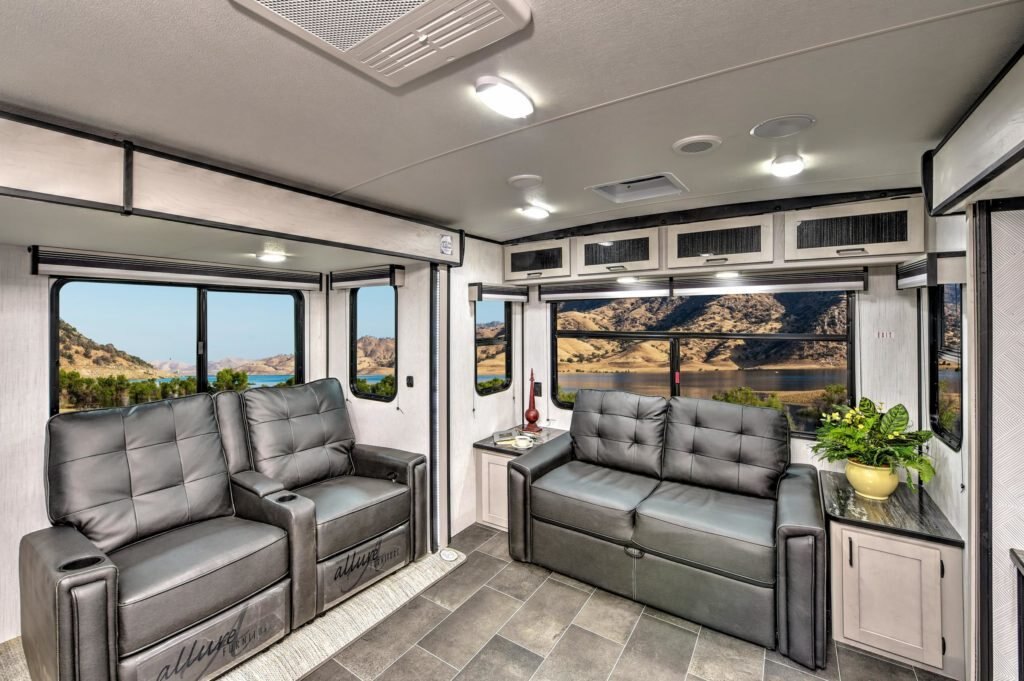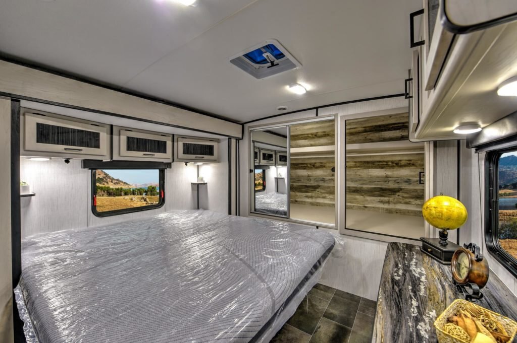 INTERIOR FEATURES All New Master Chef kitchen with new Infinity edge countertops and stainless steel under mount sink Select-a-Style, reversible booth cushions – we pick the comfort, you pick the color! (most models) Comfort Select 72″x 80″ King mattress (most models) Soft Glow backlit fascia (N/A M180BH) Newly designed entertainment center with hidden storage (most models) EZ Sweep Slideout Floors Tinted safety windows Hidden Hinges on cabinetry and Steel ball bearing drawer guides Finished and insulated pass-through storage, Slam baggage doors with magnetic latches (N/A M180BH) Friction hinge entry door WiFi prep Overstuffed residential furniture