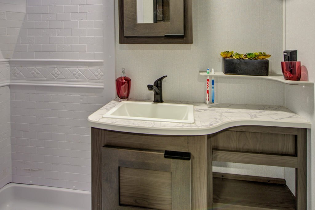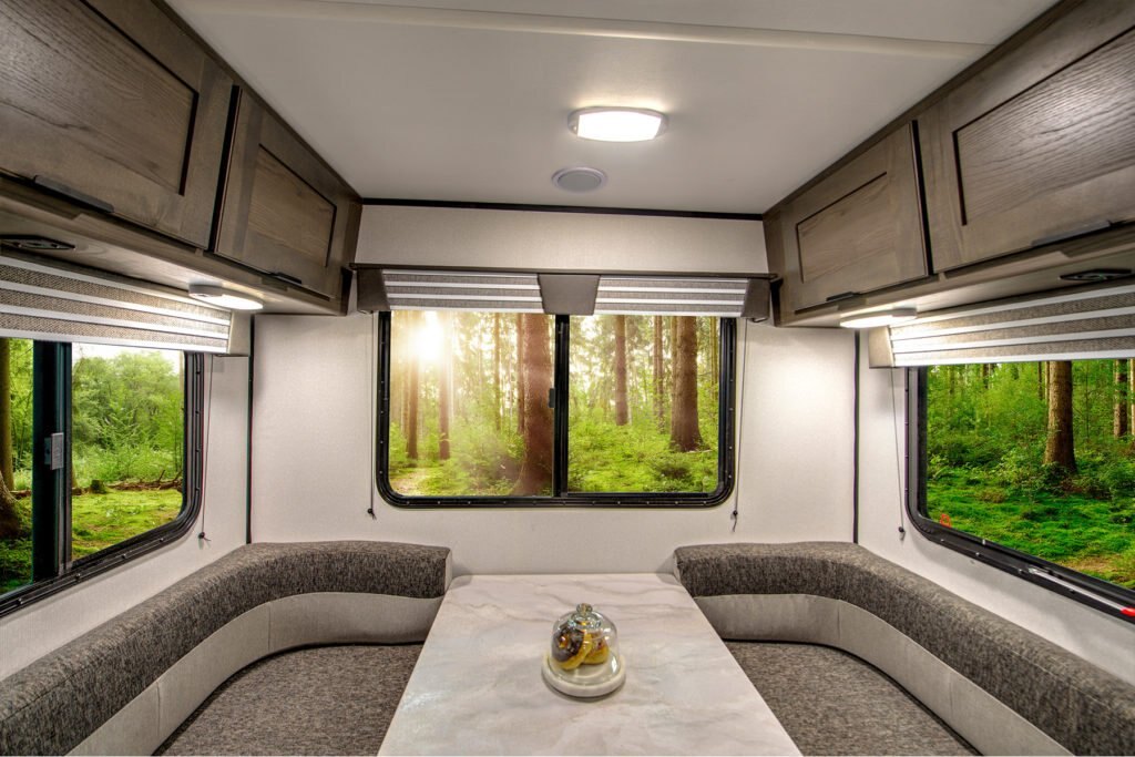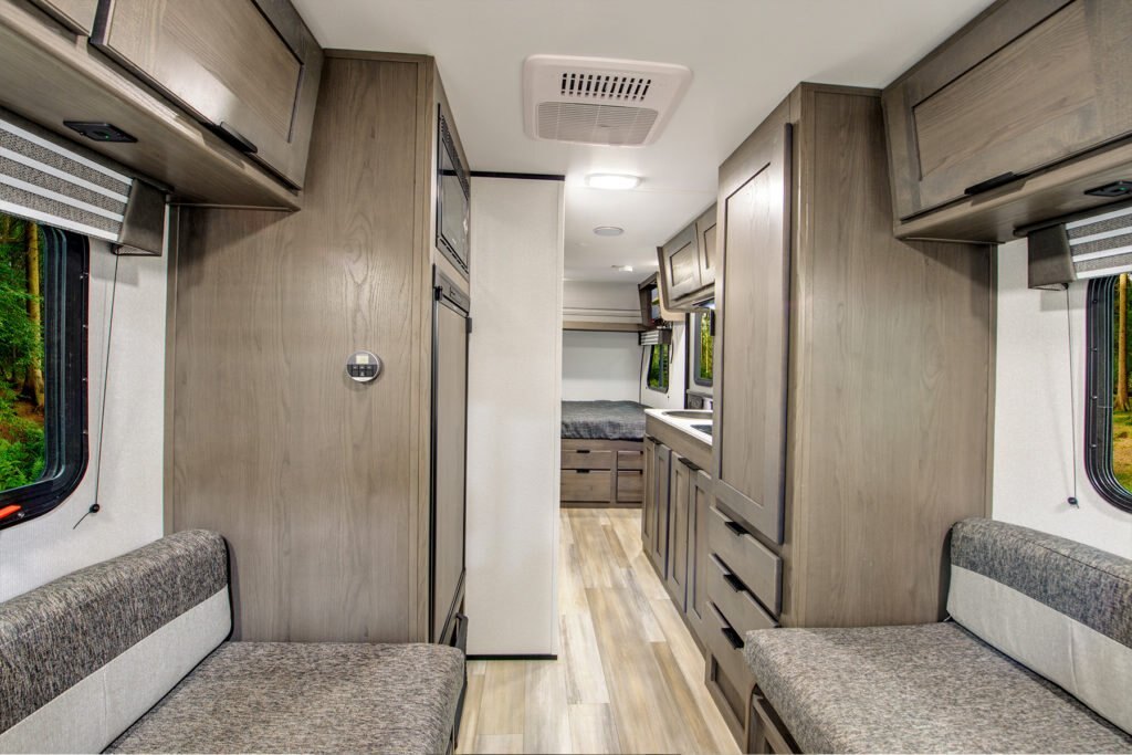 INTERIOR FEATURES All New Master Chef kitchen with new Infinity edge countertops and stainless steel under mount sink Select-a-Style, reversible booth cushions – we pick the comfort, you pick the color! (most models) Comfort Select 72″x 80″ King mattress (most models) Soft Glow backlit fascia (N/A M180BH) Newly designed entertainment center with hidden storage (most models) EZ Sweep Slideout Floors Tinted safety windows Hidden Hinges on cabinetry and Steel ball bearing drawer guides Finished and insulated pass-through storage, Slam baggage doors with magnetic latches (N/A M180BH) Friction hinge entry door WiFi prep Overstuffed residential furniture