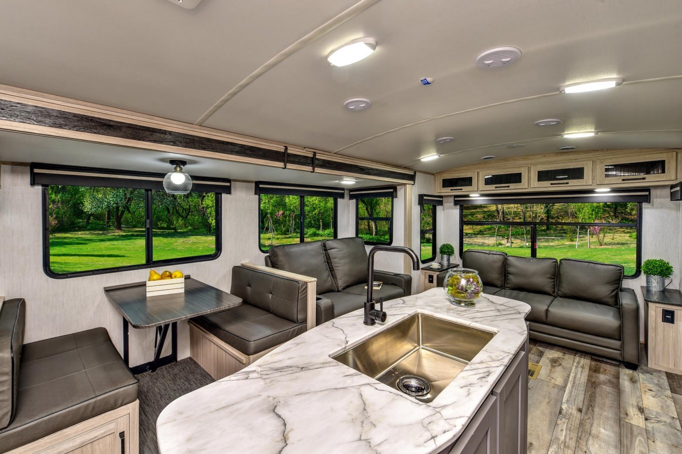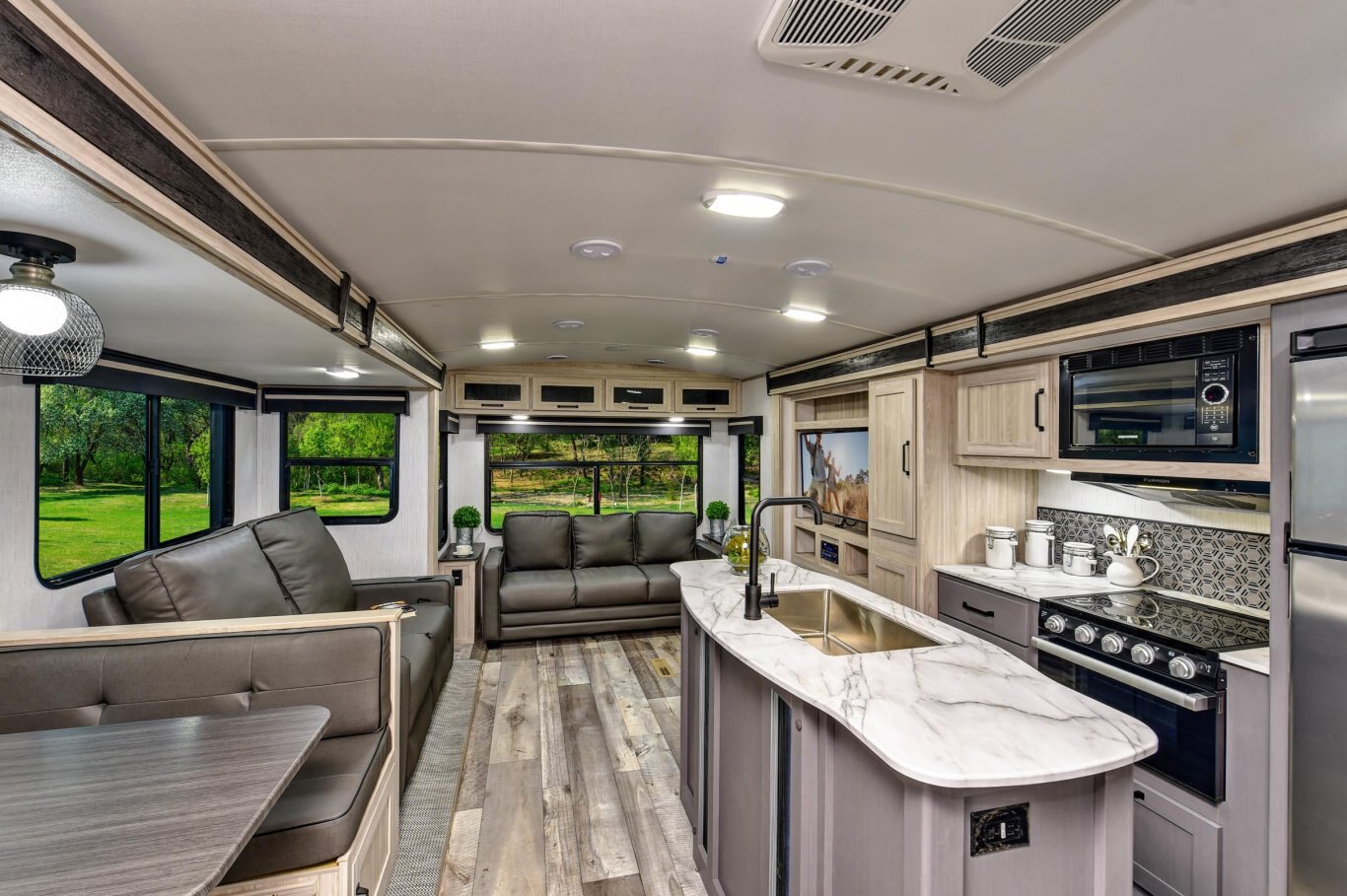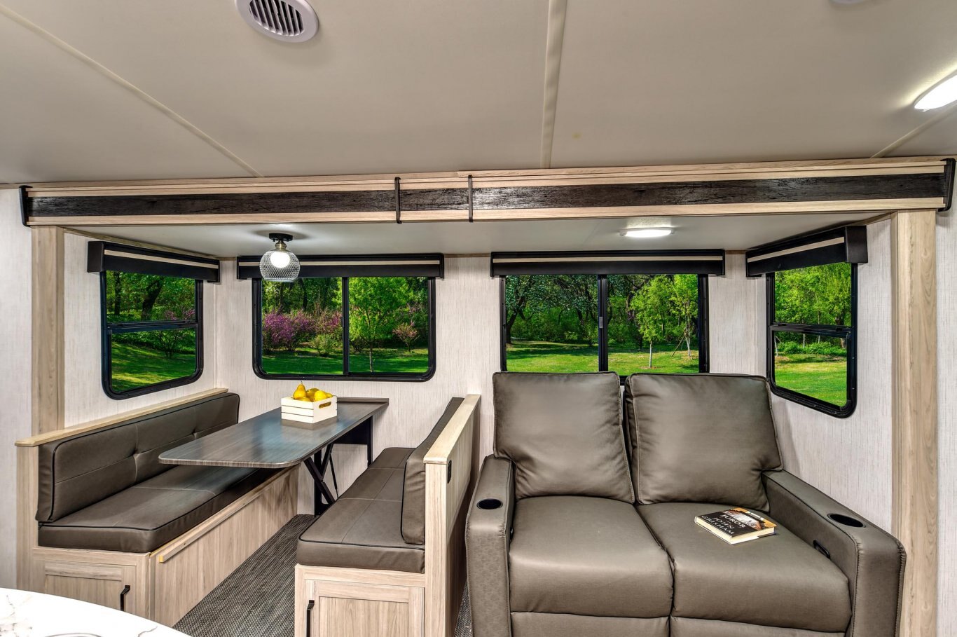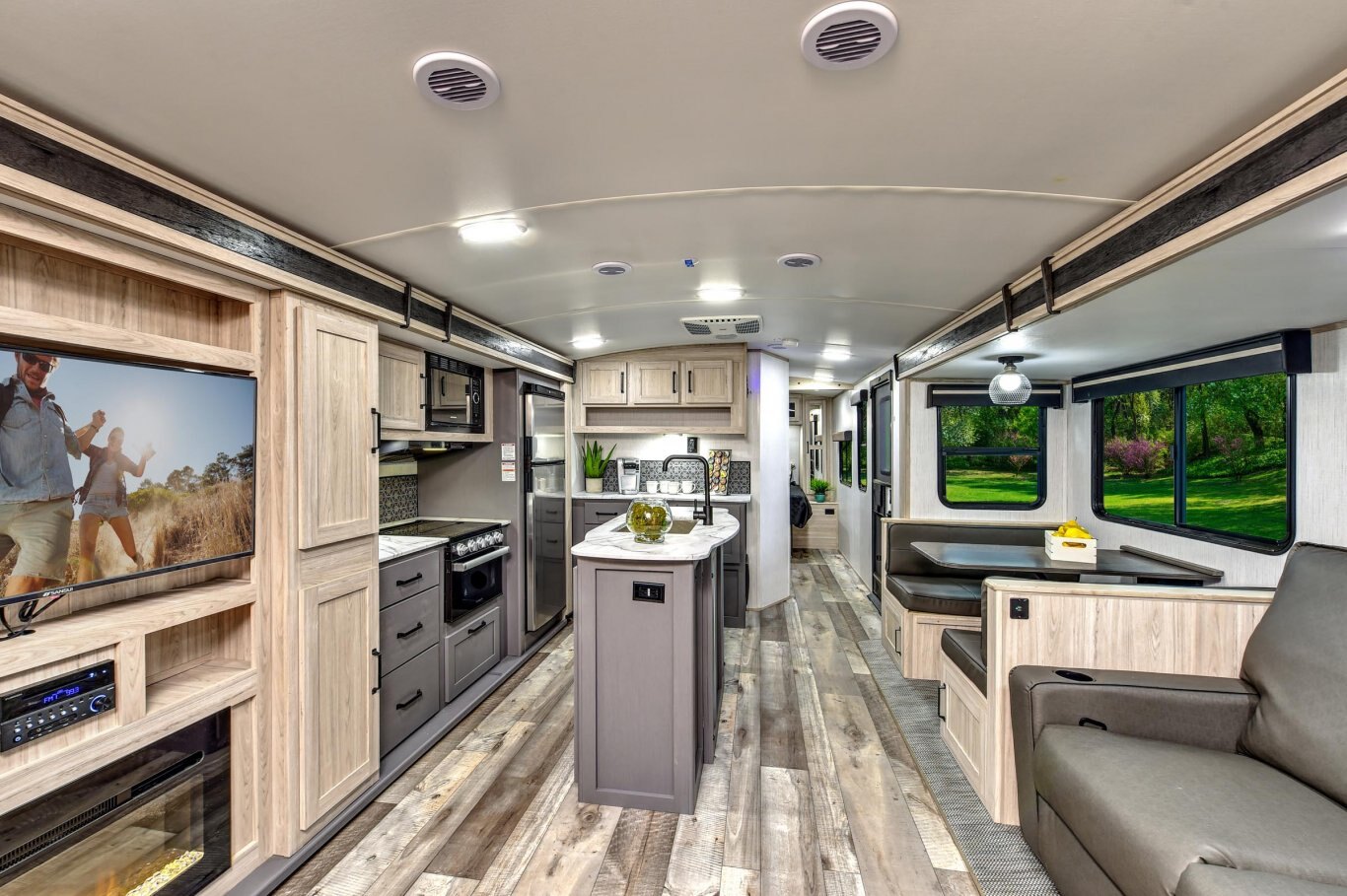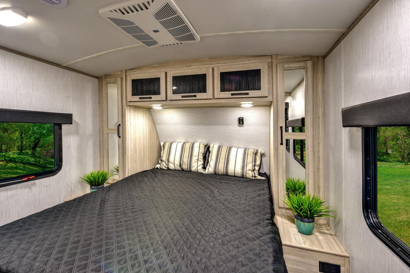Whether you’re an RV newbie or just looking for a smaller option, this RV is for you. This lightweight travel trailer offers plenty of options: from easy-to-manage single-sided coaches to double-sided bunkhouses. You’ll appreciate the clean design and privacy of roller shades on every window. And the innovative Azdel laminated sidewalls use a lightweight non-wood substrate to create a sound barrier and better insulation value.