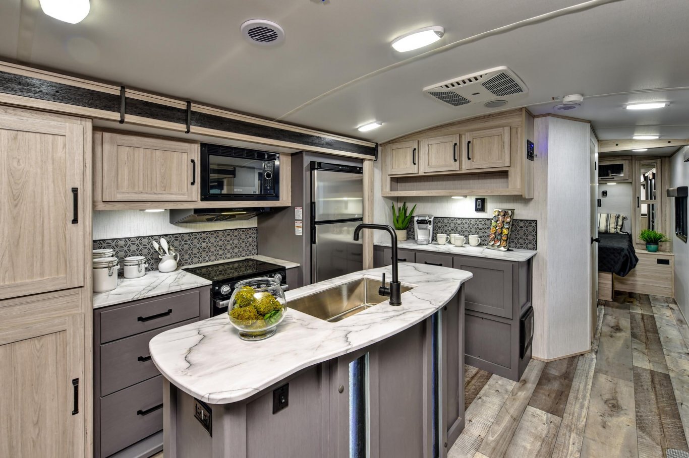 GEOMETRIC BACKSPLASH WITH MARBLE COUNTERTOPSHeartland Sundance Ultra Lite 293RL
