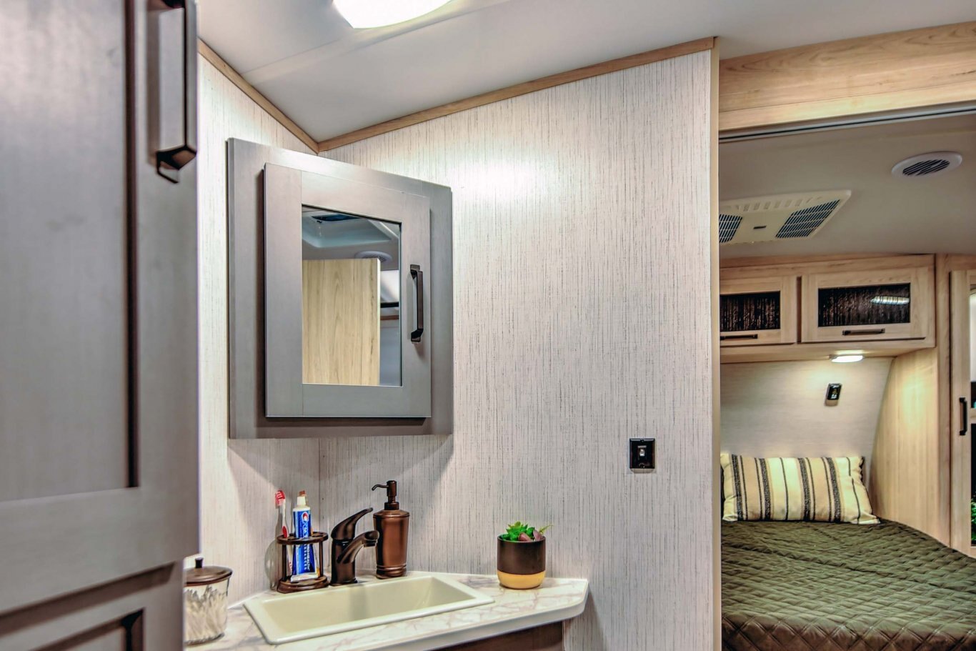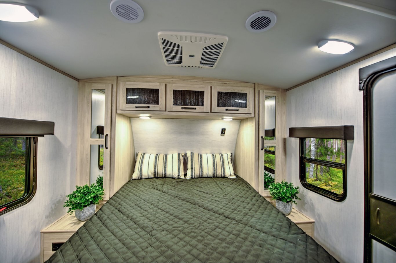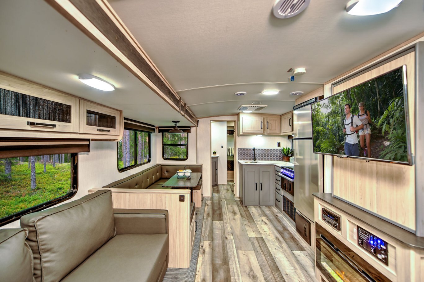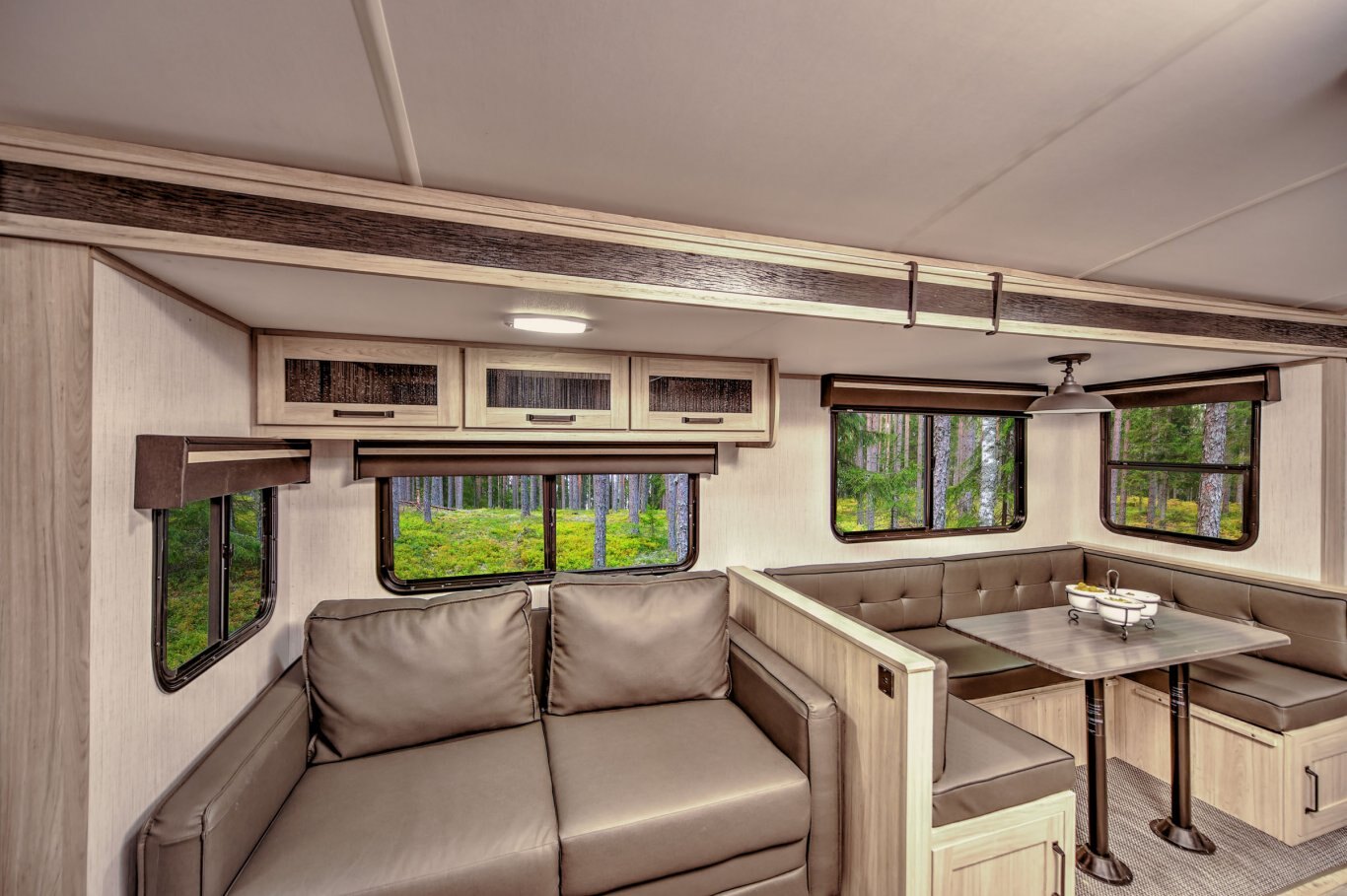 Whether you’re an RV newbie or just looking for a smaller option, this RV is for you. This lightweight travel trailer offers plenty of options: from easy-to-manage single-sided coaches to double-sided bunkhouses. You’ll appreciate the clean design and privacy of roller shades on every window. And the innovative Azdel laminated sidewalls use a lightweight non-wood substrate to create a sound barrier and better insulation value.