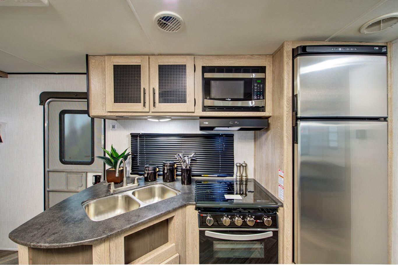 At Home Kitchen – Extra large residential refrigerator with 10 cubic ft of storage, Duralast countertops, and stainless steel double bowl undermount sink