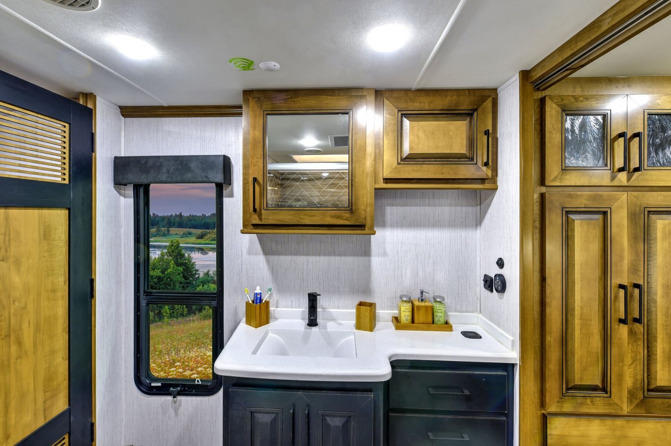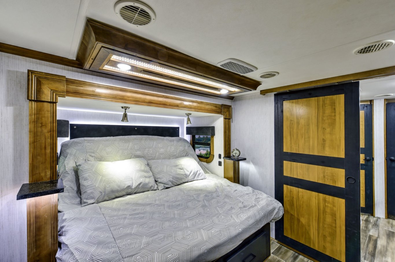 BEDROOM STANDARD FEATURES Adjustable Bedroom Reading Lights Power tilt king bed Two windows in bed slide for cross breeze 6´4˝ bedroom upper deck ceiling height throughout Backlit headboard 32/39’’ LED bedroom television