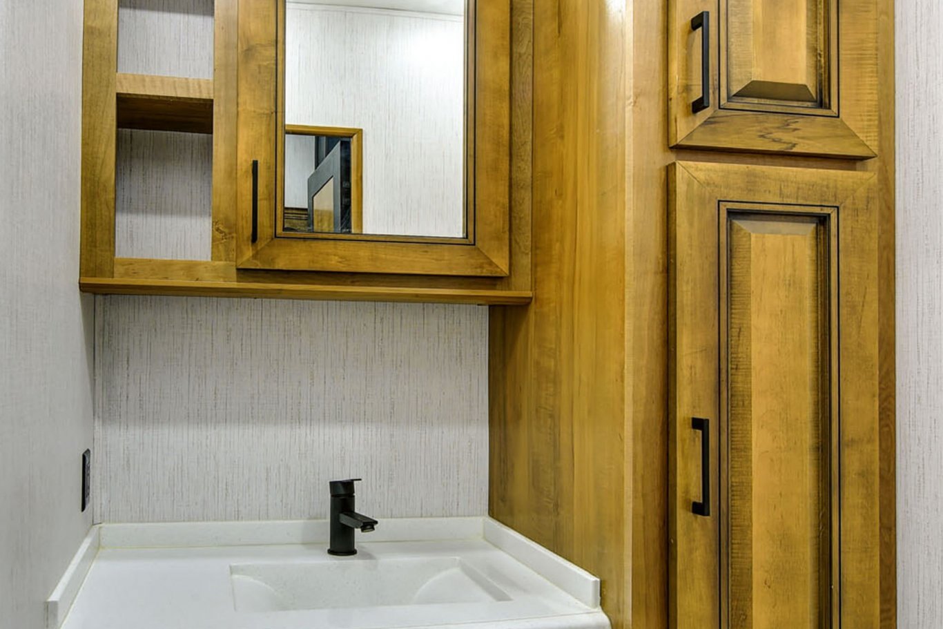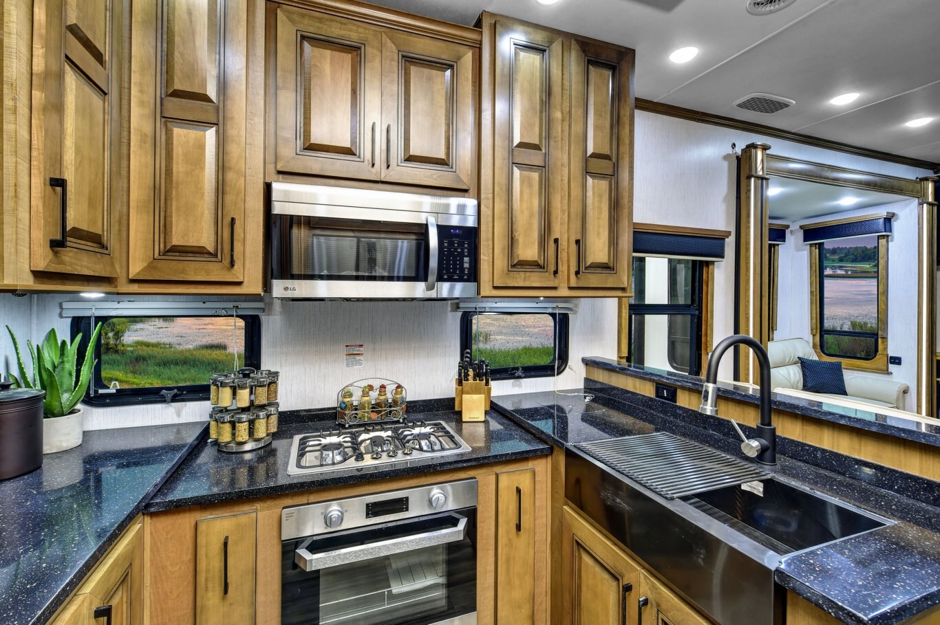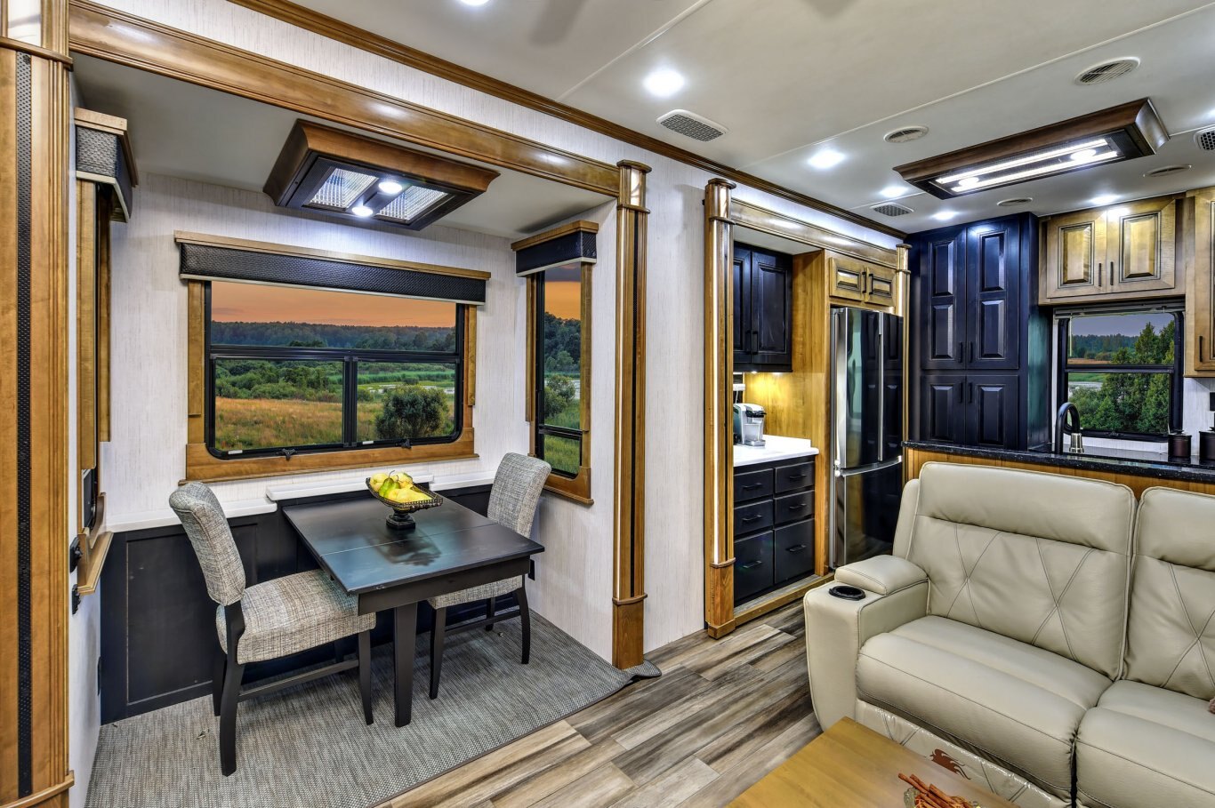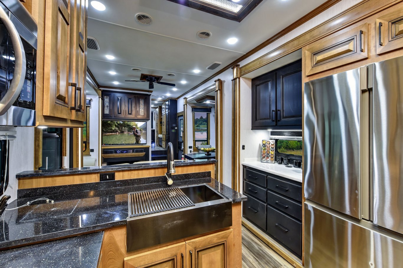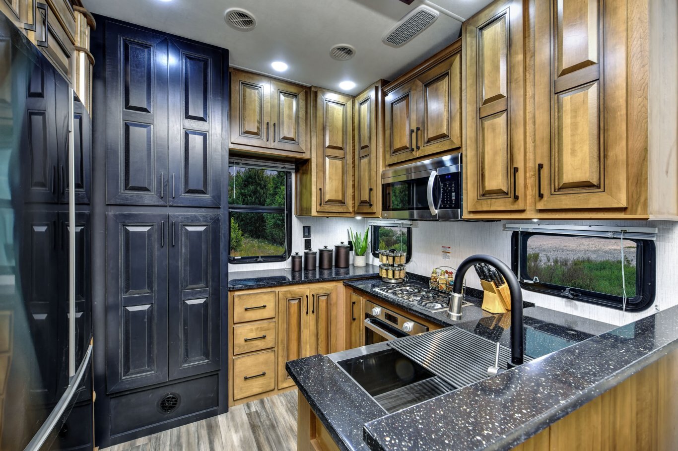 KITCHEN STANDARD FEATURES 2-tone “Black and Tan” maple material 100% hardwood stiles, cabinetry & fascia Amish-crafted natural hardwood cabinet doors with hidden hinges and drawers 30˝ microwave oven over the range In-house milled and finished solid surface countertops throughout Residential size farmhouse stainless steel kitchen sink with butcher block cutting board sink cover Single basin stainless steel kitchen sink with front apron Residential Refrigerator with water and ice Backlit kitchen backsplash panel
