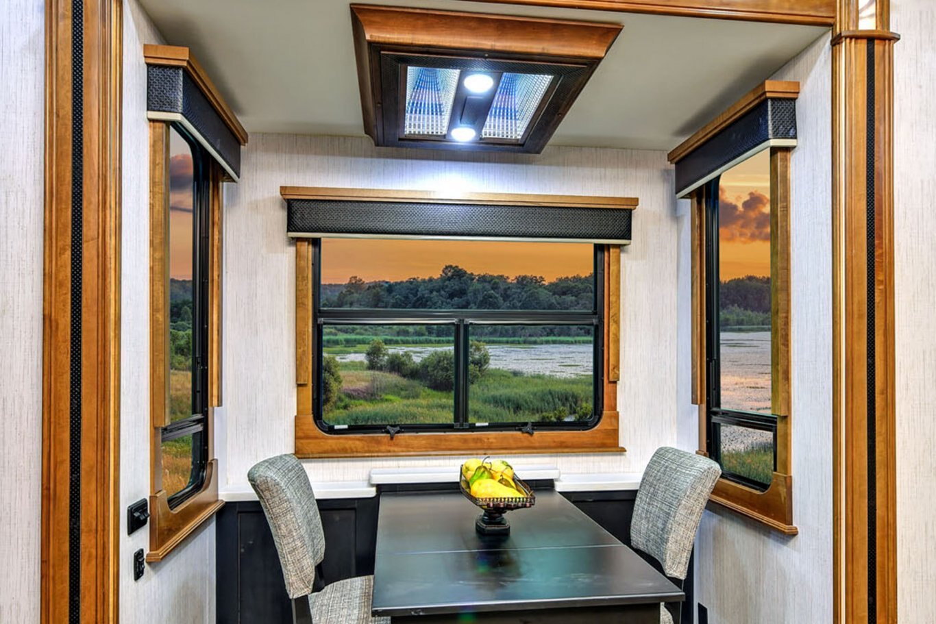 CONSTRUCTION FEATURES In-house constructed laminated fiberglass sidewalls Double-welded aircraft quality aluminum superstructure cage construction In-house constructed 3’’ vacuum bonded laminated main and upper deck floors Walkable roof decking with wood roof trusses 16’’ on center or less Radius metal cap at roof/sidewall transition 12˝ I-beam frame with rust prohibitive coating Heated and enclosed underbelly Heated and Insulated holding tanks & gate valves Surge Protection 1000 Watt Invertor 50 Amp Service YETI insulation package (12V heat tape/strips, front cap insulation)