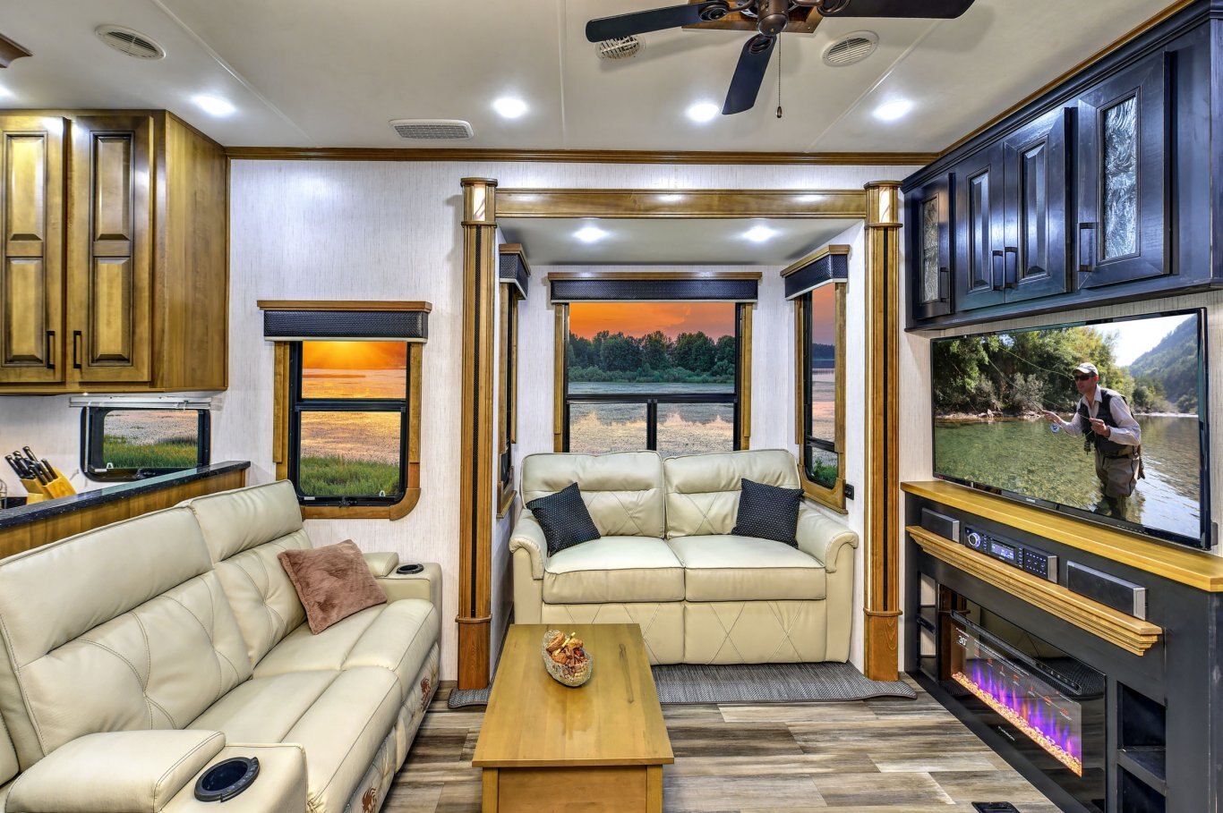 OPTIONAL FEATURES High-rise coffee table with built in storage Heat pump on main A/C Dishwasher (n/a all floor plans) Stackable washer/dryer Slide out topper awnings 5.5 KW micro quiet Onan generator 300W solar panel with 30 amp controller and 2000W inverter