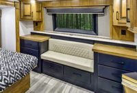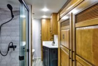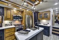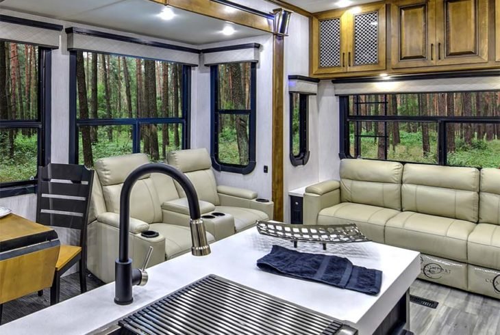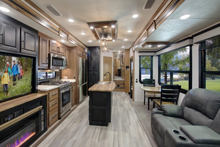 INTERIOR FEATURES Triple Top” 3 separate kitchen surface workspaces for superior kitchen flow (most floor plans) “True Wood” 100% maple hardwood cabinetry & fascia in dynamic “Black and Tan” 2-tone wood package “Spa Baths” with solid surface sinks, marble look shower, removable shower head and teak wood seat Straight roof line and ‘elite height’ main slides for increased space and storage In-house constructed vacuum-bonded laminated main and upper deck floors Night roller shades Power theater seating with heat and massage Dual panoramic windows in main slide Whisper quiet A/C system – includes dual high output 15,000 BTU A/C units (3rd AC option) 55˝ LED living room television