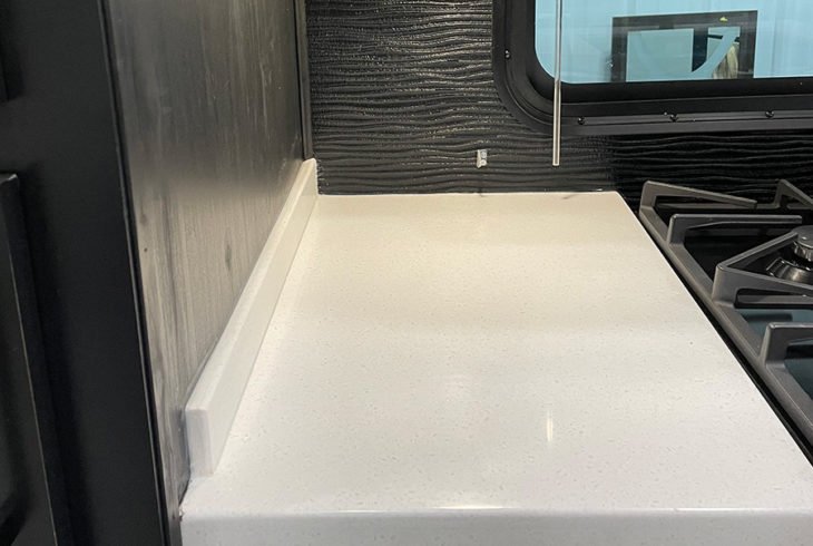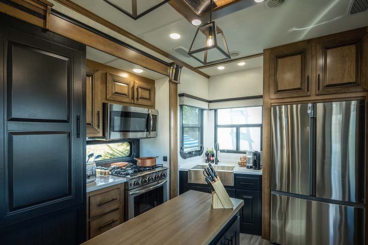 KITCHEN STANDARD FEATURES Amish -crafted 100% hardwood cabinetry, fascia and doors with hidden hinges and drawers 30˝ microwave oven over the range In-house milled and finished solid surface countertops throughout Residential size, stainless steel kitchen sink with matching solid surface sink covers Live edge dinette table with 2 standard and 2 folding chairs Single basin stainless steel kitchen sink with front apron